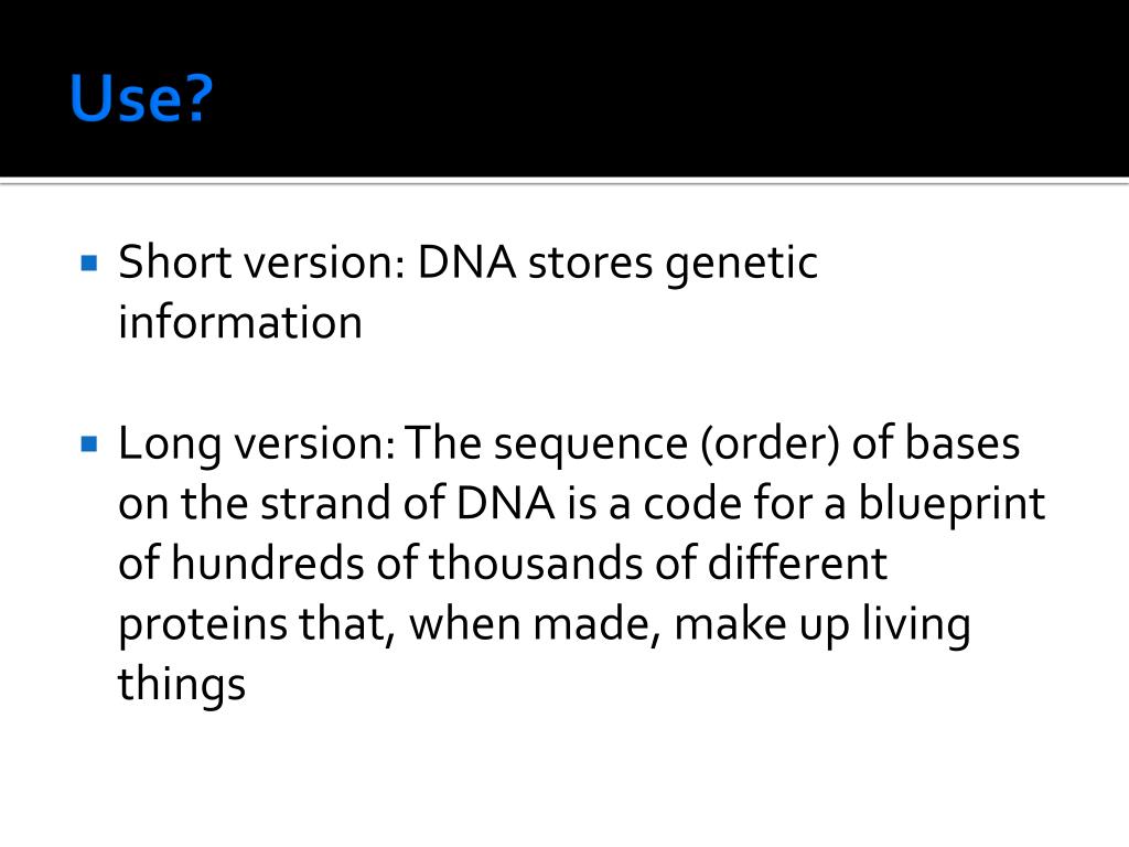 Use? • Short version: DNA stores genetic information • Long version: The sequence (order) of bases on the strand of DNA is a code for a blueprint of hundreds of thousands of different proteins that, when made, make up living things