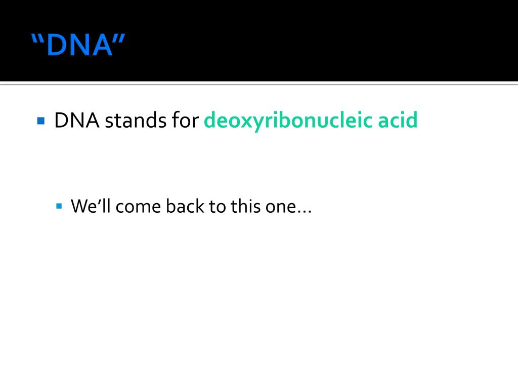 “DNA” • DNA stands for deoxyribonucleic acid • We’ll come back to this one…