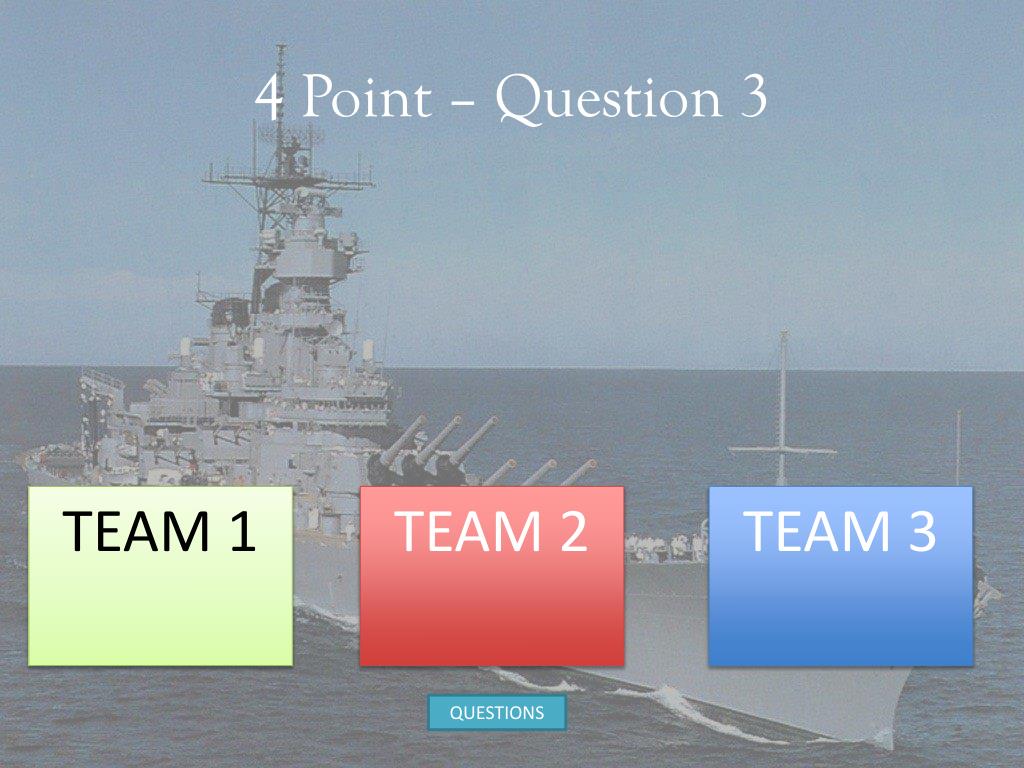 Team #2: 2 Patrol Boats (2 Pegs) 1 Destroyer (3 Pegs) 2 Submarines (3 Pegs) 2 Battleships (4 Pegs) 1 Carrier (5 Pegs) Team 1 Team 3 QUESTIONS