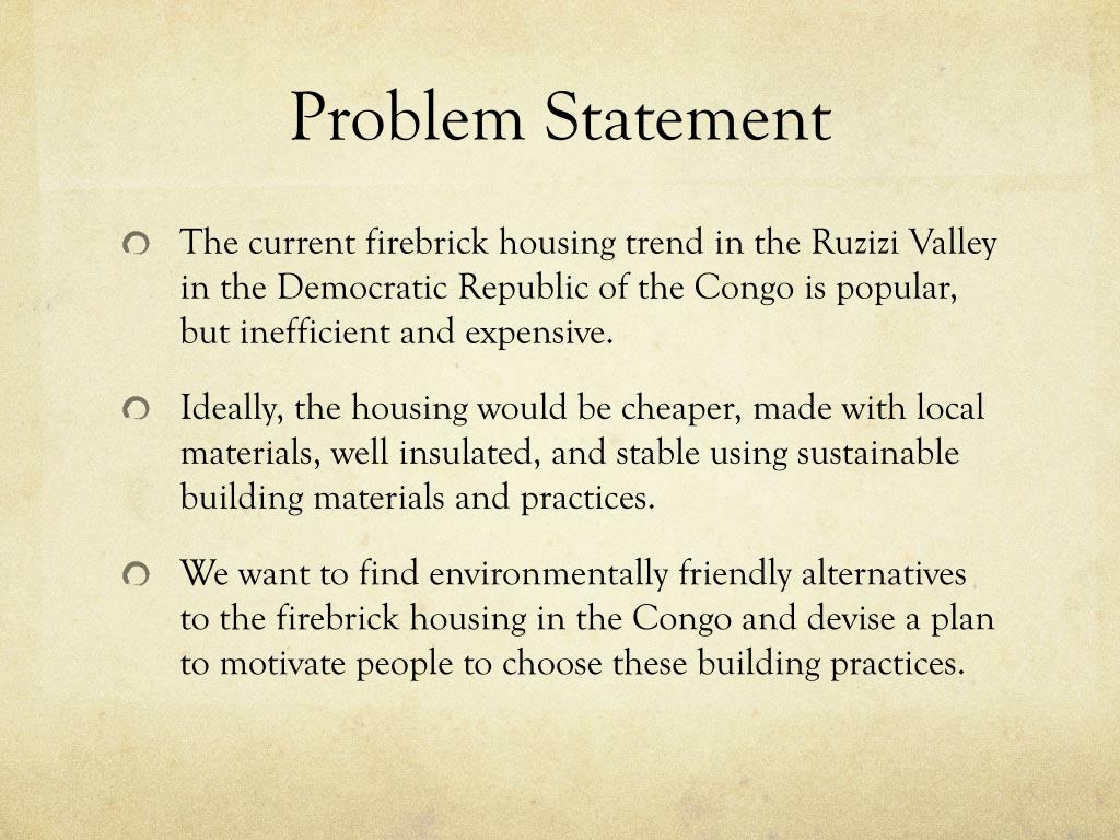 Firebrick Housing Alternatives Changing attitudes towards eco-friendly housing in the Congo. Reina Ingham, Lindsay MacLeod, Reyna Schenck , Melissa Sullivan. Problem Statement.