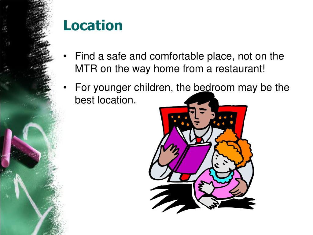 Location • Find a safe and comfortable place, not on the MTR on the way home from a restaurant! • For younger children, the bedroom may be the best location.