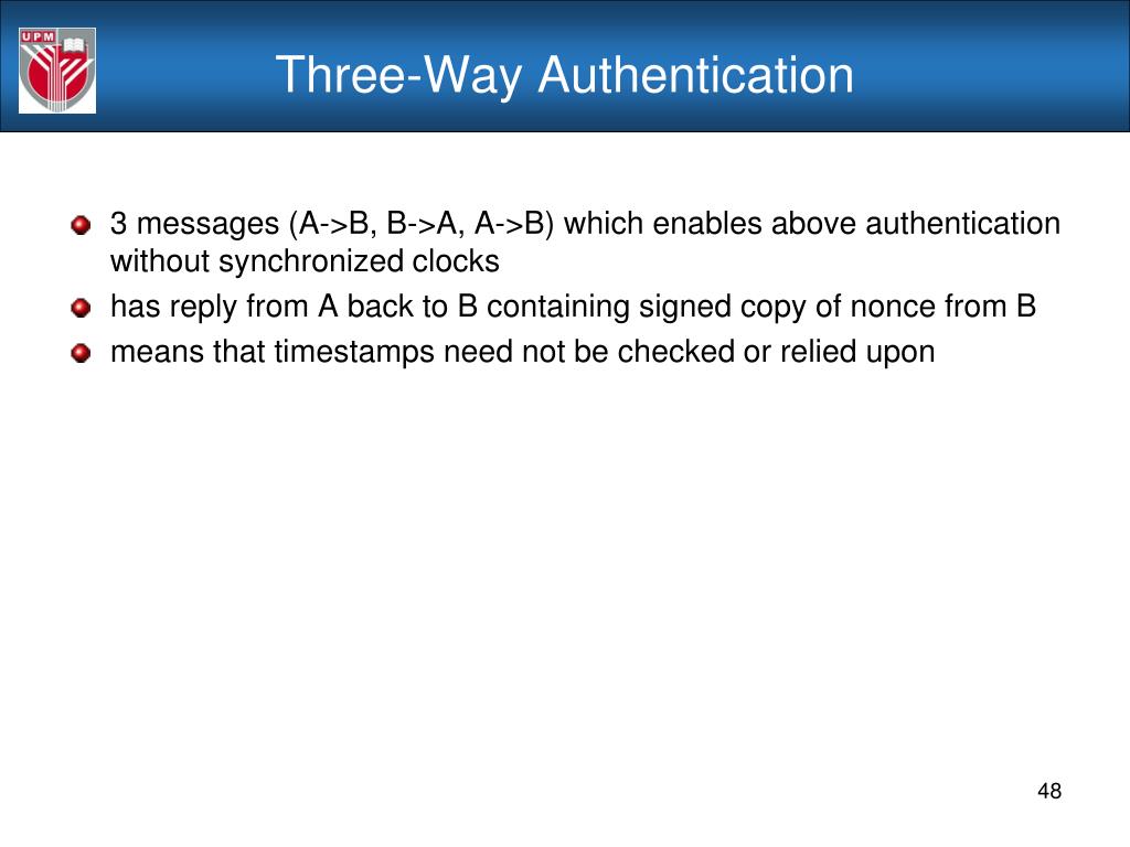 Three-Way Authentication • 3 messages (A->B, B->A, A->B) which enables above authentication without synchronized clocks • has reply from A back to B containing signed copy of nonce from B • means that timestamps need not be checked or relied upon