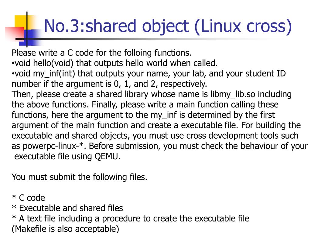 No.3:shared object (Linux cross) • Please write a C code for the folloing functions. • void hello(void) that outputs hello world when called. • void my_inf(int) that outputs your name, your lab, and your student ID • number if the argument is 0, 1, and 2, respectively. • Then, please create a shared library whose name is libmy_lib.so including • the above functions. Finally, please write a main function calling these • functions, here the argument to the my_inf is determined by the first • argument of the main function and create a executable file. For building the • executable and shared objects, you must use cross development tools such • as powerpc-linux-*. Before submission, you must check the behaviour of your • executable file using QEMU. • You must submit the following files. • * C code • * Executable and shared files • * A text file including a procedure to create the executable file • (Makefile is also acceptable)