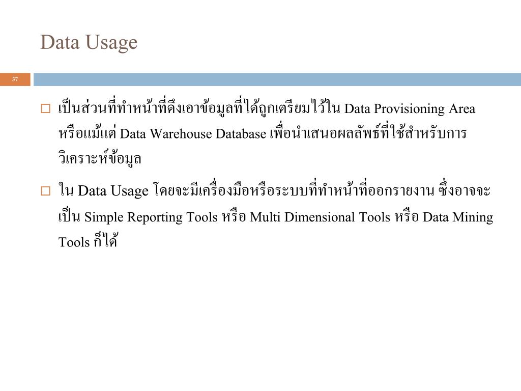 Data Usage • เป็นส่วนที่ทำหน้าที่ดึงเอาข้อมูลที่ได้ถูกเตรียมไว้ใน Data Provisioning Area หรือแม้แต่ Data Warehouse Database เพื่อนำเสนอผลลัพธ์ที่ใช้สำหรับการวิเคราะห์ข้อมูล • ใน Data Usageโดยจะมีเครื่องมือหรือระบบที่ทำหน้าที่ออกรายงาน ซึ่งอาจจะเป็น Simple Reporting Tools หรือ Multi Dimensional Tools หรือ Data Mining Tools ก็ได้