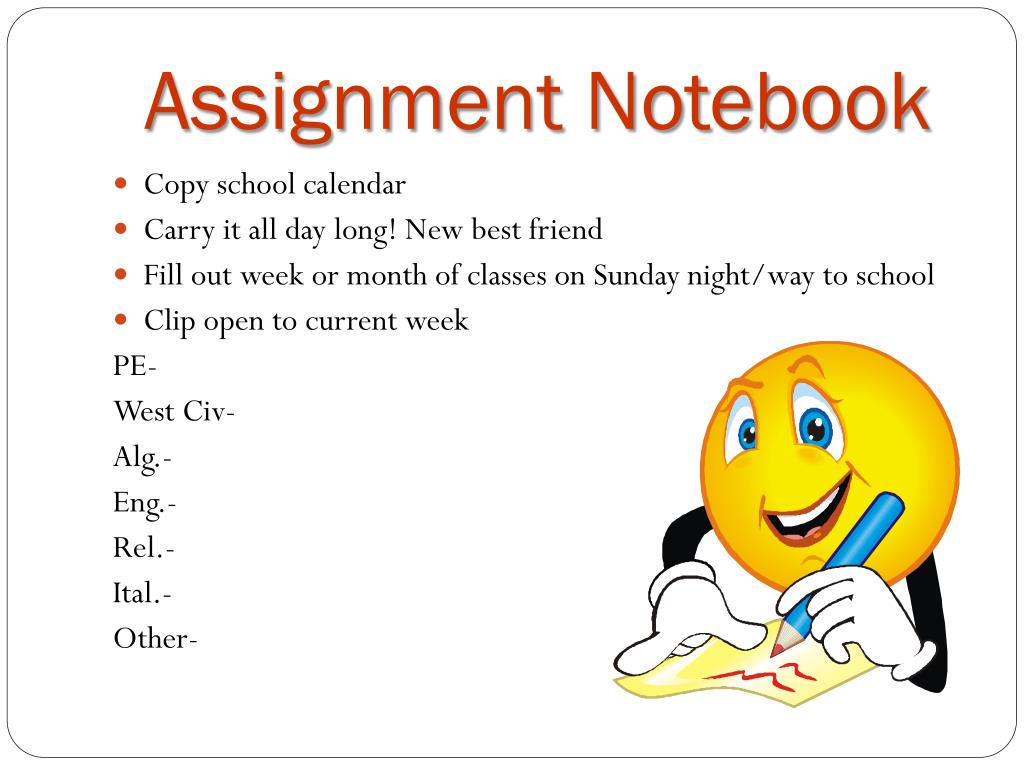 Assignment Notebook • Copy school calendar • Carry it all day long! New best friend • Fill out week or month of classes on Sunday night/way to school • Clip open to current week PE- West Civ- Alg.- Eng.- Rel.- Ital.- Other-