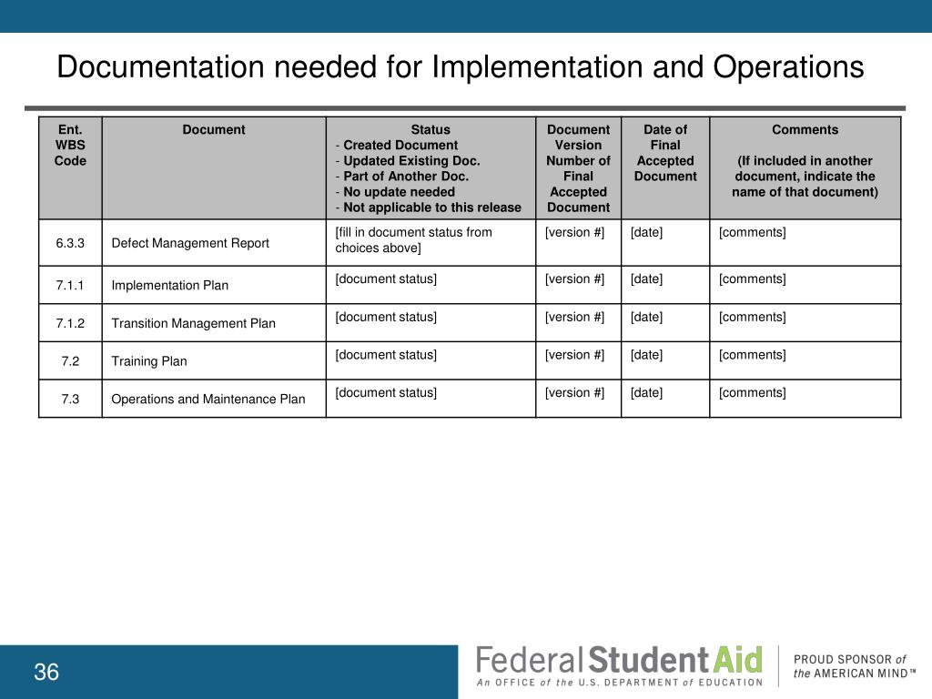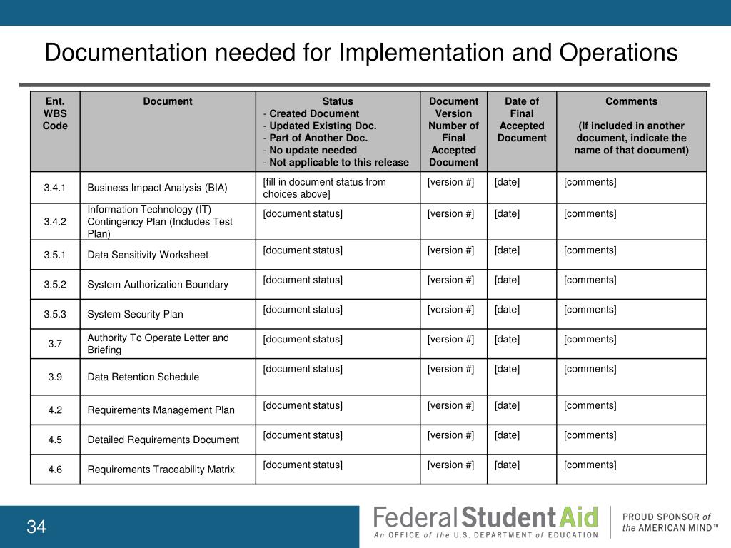 PRR Approval (Page 2 of 2) Federal Student Aid approves implementation of [System / Release Name and Version] on [implementation date] based on the information included in this Production Readiness Review. • ___________________________________ ___________________________________ • Mike Rockis or designee Wanda Broadus or designee • Enterprise Quality Assurance Program Technology Office Management • Based on the operational risk associated with implementation of this release, sign-off by FSA Senior Management may be required as indicated below. Factors considered in determining operational risk include system criticality, end-user type and volume, number and complexity of system interfaces, release size, technology used by the release, implementation team maturity, and timing of the release implementation within FSA’s business cycle. • Determination by Enterprise Quality Assurance Program: • Senior Management Sign-off is required. • Senior Management Sign-off is not required. • ___________________________________ ___________________________________ • Jerry Williams or designee [Name of Operating Committee Member] • FSA Chief Information Officer [Title of Operating Committee Member]
