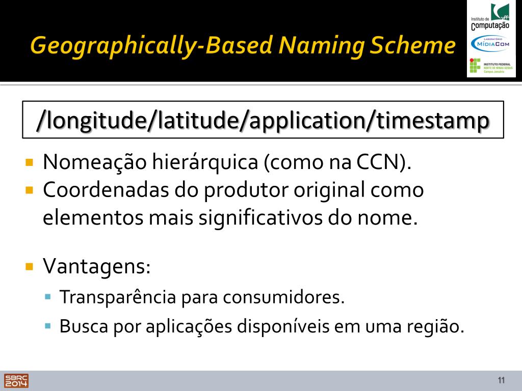 Geographically-BasedNamingScheme /longitude/latitude/application/timestamp • Nomeação hierárquica (como na CCN). • Coordenadas do produtor original como elementos mais significativos do nome. • Vantagens: • Transparência para consumidores. • Busca por aplicações disponíveis em uma região.