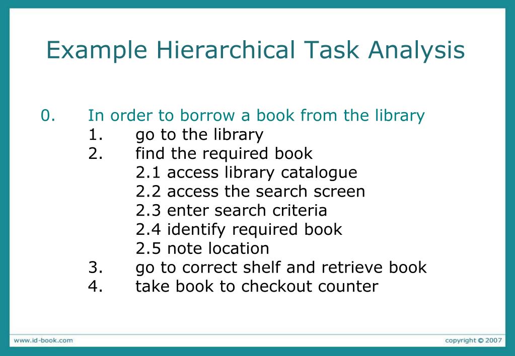 Example Hierarchical Task Analysis 0. In order to borrow a book from the library 1. go to the library 2. find the required book 2.1 access library catalogue 2.2 access the search screen 2.3 enter search criteria 2.4 identify required book 2.5 note location 3. go to correct shelf and retrieve book 4. take book to checkout counter