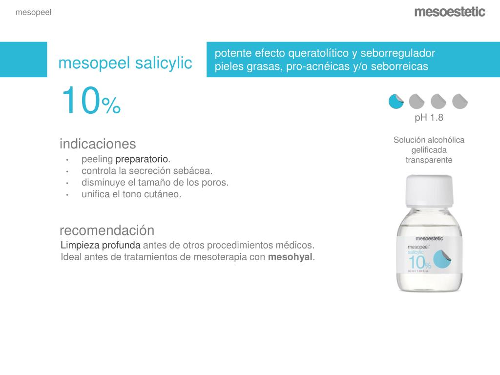 potente efecto queratolítico y seborregulador pieles grasas, pro-acnéicas y/o seborreicas 10% pH 1.8 Solución alcohólica gelificada transparente indicaciones • peeling preparatorio. • controla la secreción sebácea. • disminuye el tamaño de los poros. • unifica el tono cutáneo. recomendación Limpieza profunda antes de otros procedimientos médicos. Ideal antes de tratamientos de mesoterapia con mesohyal.