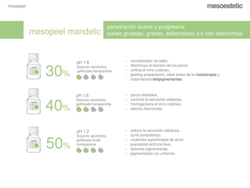 penetración suave y progresiva pieles gruesas, grasas, seborreicas y/o con discromías • normalizador de sebo. • disminuye el tamaño de los poros. • unifica el tono cutáneo. • peeling preparatorio, ideal antes de la mesoterapiay tratamientos despigmentantes. pH 1.8 Solución alcohólica gelificada transparente 30% • poros dilatados. • controla la secreción sebácea. • homogeneiza el tono cutáneo. • atenúa discromías. pH 1.8 Solución alcohólica gelificada transparente 40% • reduce la secreción sebácea. • acné comedónico. • cicatrices superficiales de acné. • queratosis actínica leve. • lesiones pigmentarias • pigmentación no uniforme. pH 1.2 Solución alcohólica gelificada fluida transparente 50%