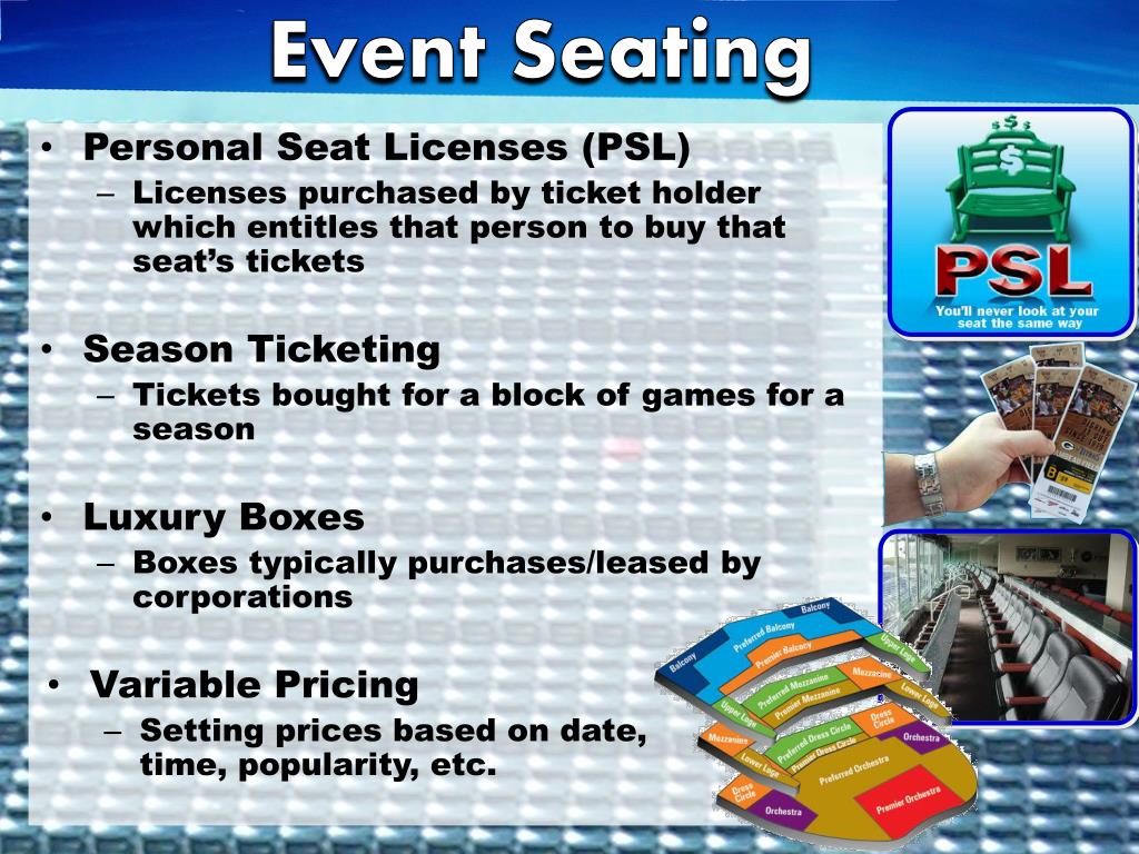 Event Seating • Personal Seat Licenses (PSL) • Licenses purchased by ticket holder which entitles that person to buy that seat’s tickets • Season Ticketing • Tickets bought for a block of games for a season • Luxury Boxes • Boxes typically purchases/leased by corporations • Variable Pricing • Setting prices based on date, time, popularity, etc.