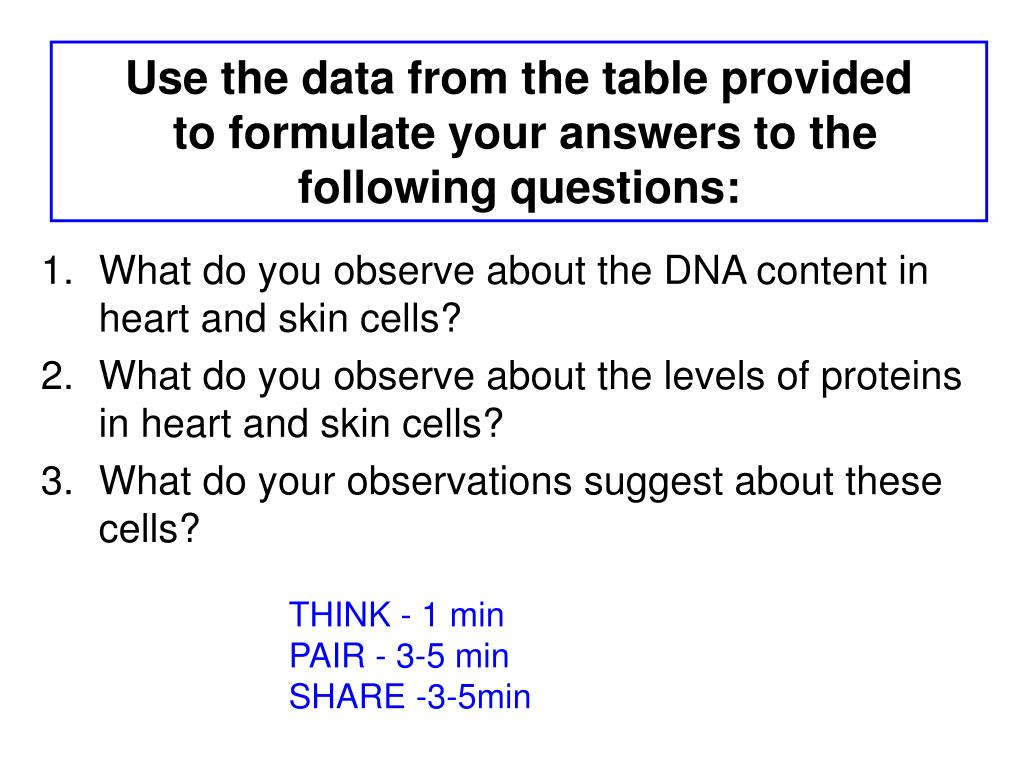 Use the data from the table provided to formulate your answers to the following questions: • What do you observe about the DNA content in heart and skin cells? • What do you observe about the levels of proteins in heart and skin cells? • What do your observations suggest about these cells? THINK - 1 min PAIR - 3-5 min SHARE -3-5min