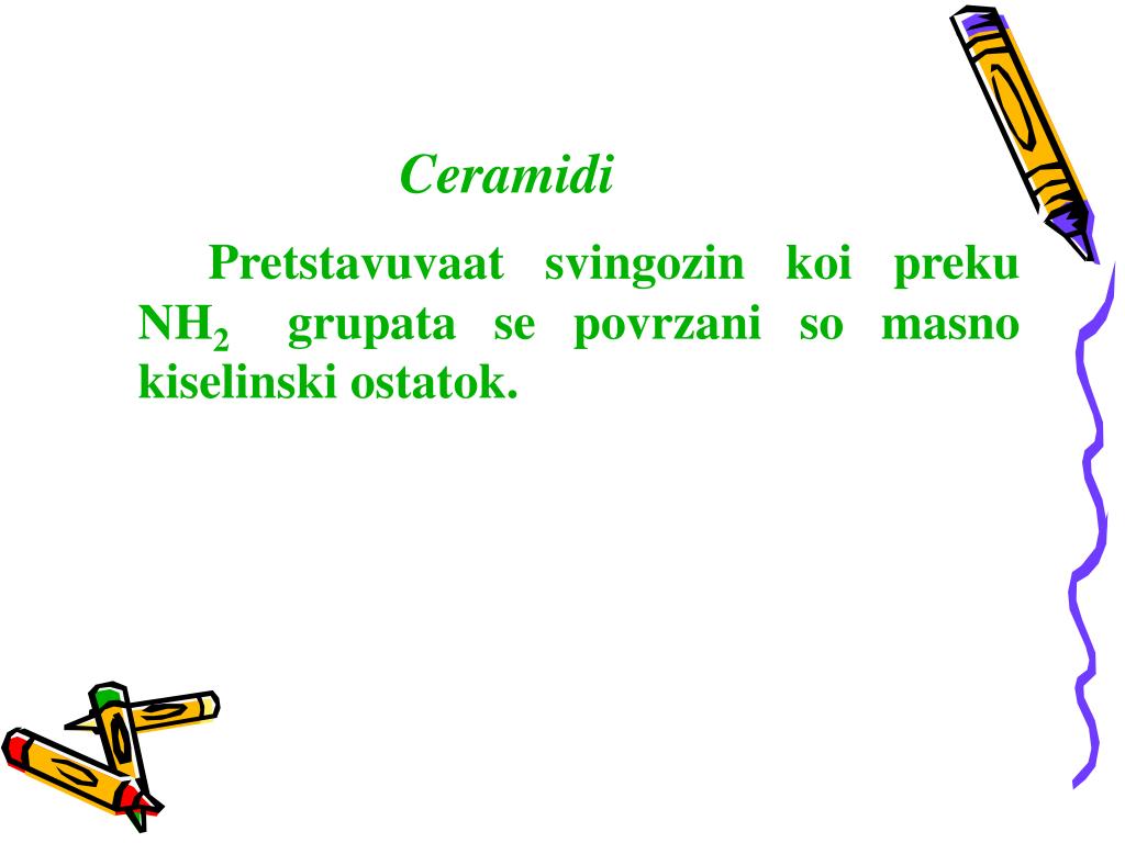 Ceramidi Pretstavuvaat svingozin koi preku NH2grupata se povrzani so masno kiselinski ostatok.