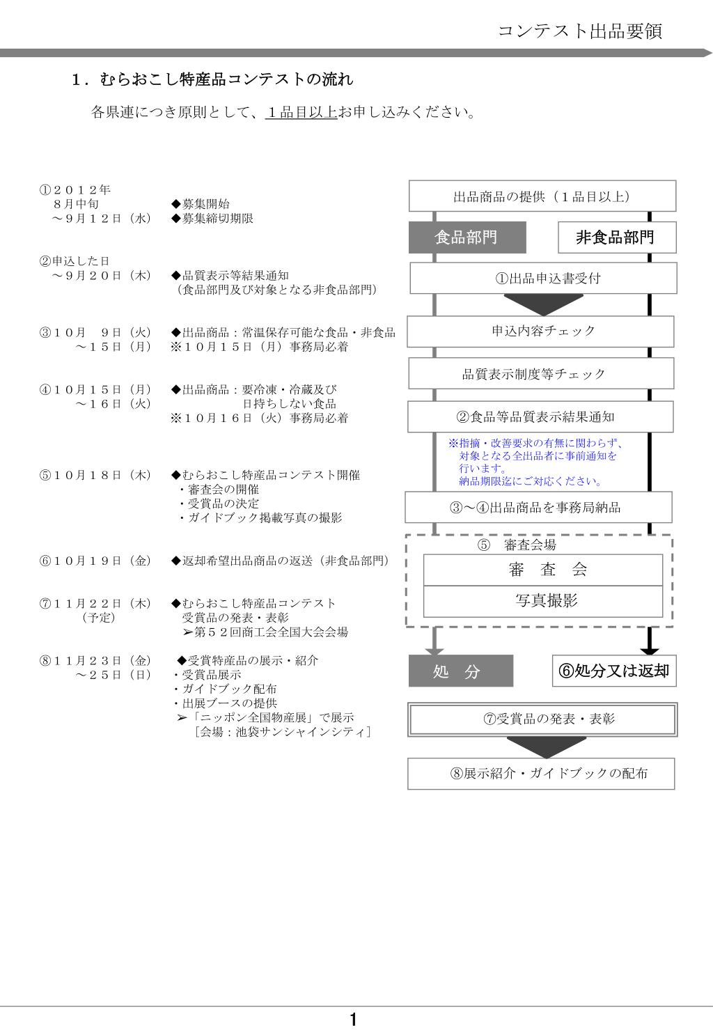全国商工会連合会. 別紙2. 平成24年度 むらおこし特産品コンテスト. 出 品 要 領. 平成24年8月. コンテスト出品要領. 1.むらおこし特産品コンテストの流れ. 各県連につき原則として、 1品目以上 お申し込みください。. ①2012年 8月中旬 ◆募集開始 ~9月12日(水) ◆募集締切期限 ②申込した日 ~9月20日(木) ◆品質表示等結果通知 (食品部門及び対象となる非食品部門) ③10月 9日(火) ◆出品商品:常温保存可能な食品・非食品 ~15日(月) ※ 10月15日(月)事務局必着