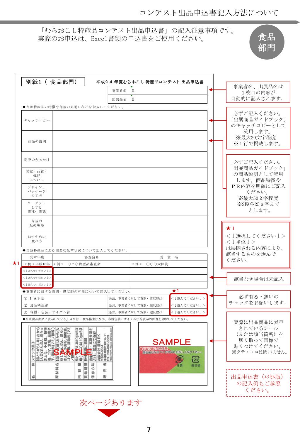 コンテスト出品申込書記入方法について 「むらおこし特産品コンテスト出品申込書」の記入注意事項です。 実際のお申込は、Excel書類の申込書をご使用ください。 食品 部門 事業者名、出展品名は 1枚目の内容が 自動的に記入されます。 必ずご記入ください。 「出展商品ガイドブック」 のキャッチコピーとして 流用します。 ※最大20文字程度 ※1行で掲載します。 必ずご記入ください。 「出展商品ガイドブック」 の商品説明として流用 します。商品特徴や PR内容を明確にご記入 ください。 ※最大50文字程度 ※2段各25文字まで とします。 ★1 <↓選択してください↓> <↓単位↓> は展開される内容により、 該当するものを選んで ください。 ★1 該当なき場合は未記入 ★1 必ず有る・無いの チェックをお願いします。 実際に出品商品に表示 されているシール (または該当箇所)を 切り取って画像で 貼りつけてください。 ※タテ・ヨコは問いません。 出品申込書(エクセル版) の記入例もご参照 ください。 次ページあります