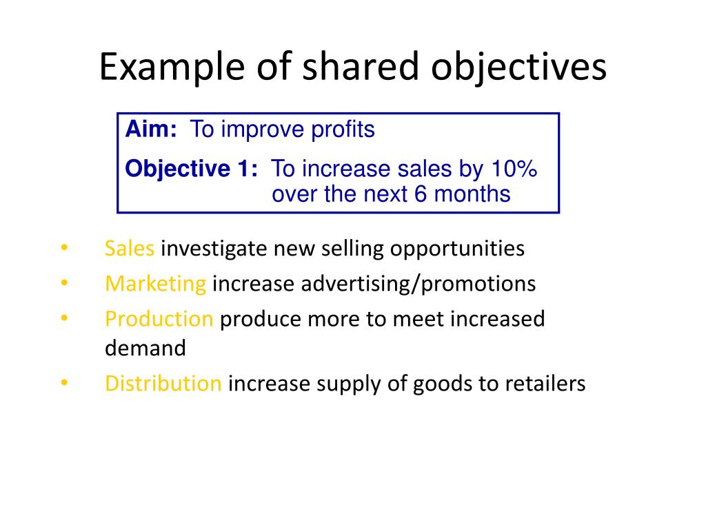Example of shared objectives Aim: To improve profits Objective 1: To increase sales by 10% over the next 6 months • Sales investigate new selling opportunities • Marketing increase advertising/promotions • Production produce more to meet increased demand • Distribution increase supply of goods to retailers