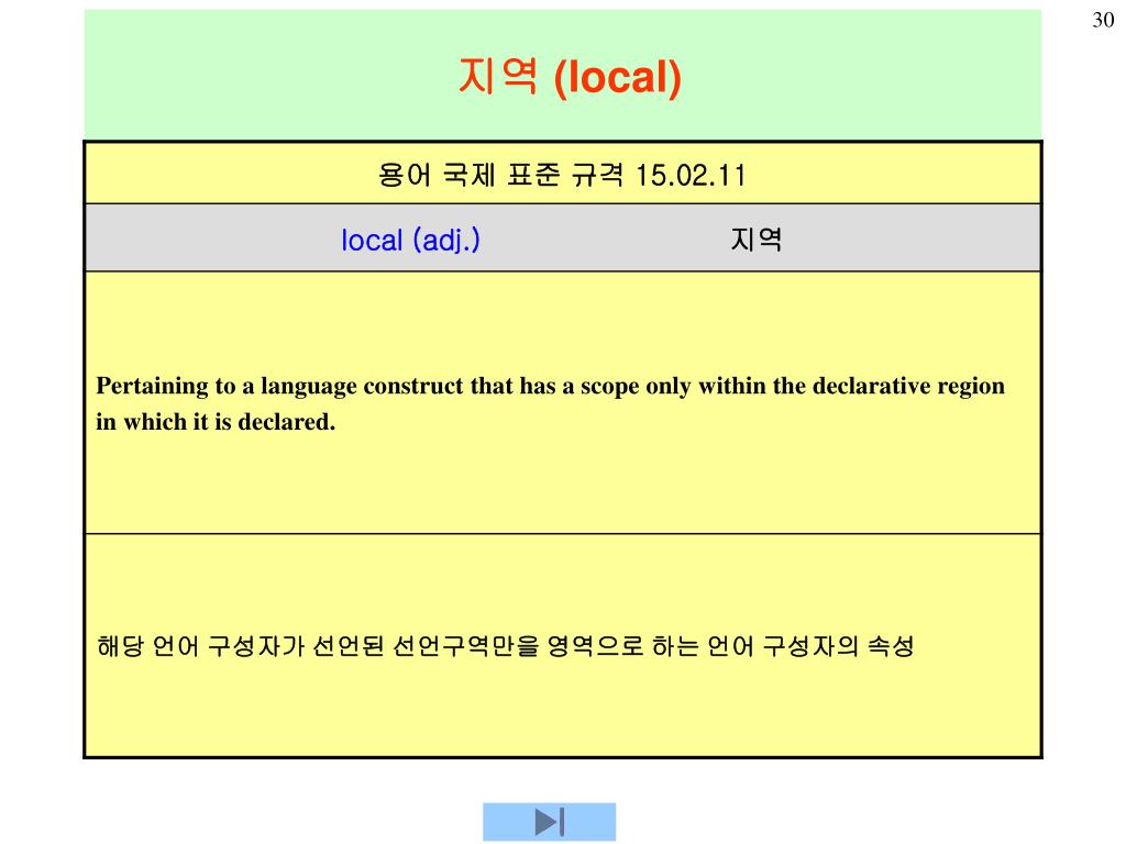 1 a : begin integer i, j; real x, y; • b : procedure test(integer a, b) • begin boolean I; • . . . • x : = I * j +y; • . . . • end b; • . . . • c : begin integer x, y; real i, j; • d : begin boolean j; • . . . • call test(x, y); • . . . • end d; • . . • . . . • end a; b : procedure test(integer a, b) begin boolean i; . . . x : = i * j +y; . . . end b; c : begin integer x, y; real i, j; . . . d : begin boolean j; . . . call test(x, y); . . . end d; end c; d : begin boolean j; . . . call test(x, y); . . . end d; 8.2 동적 영역과 정적 영역 정적 영역 규칙 (Algol) <각 변수 영역 줄번호>
