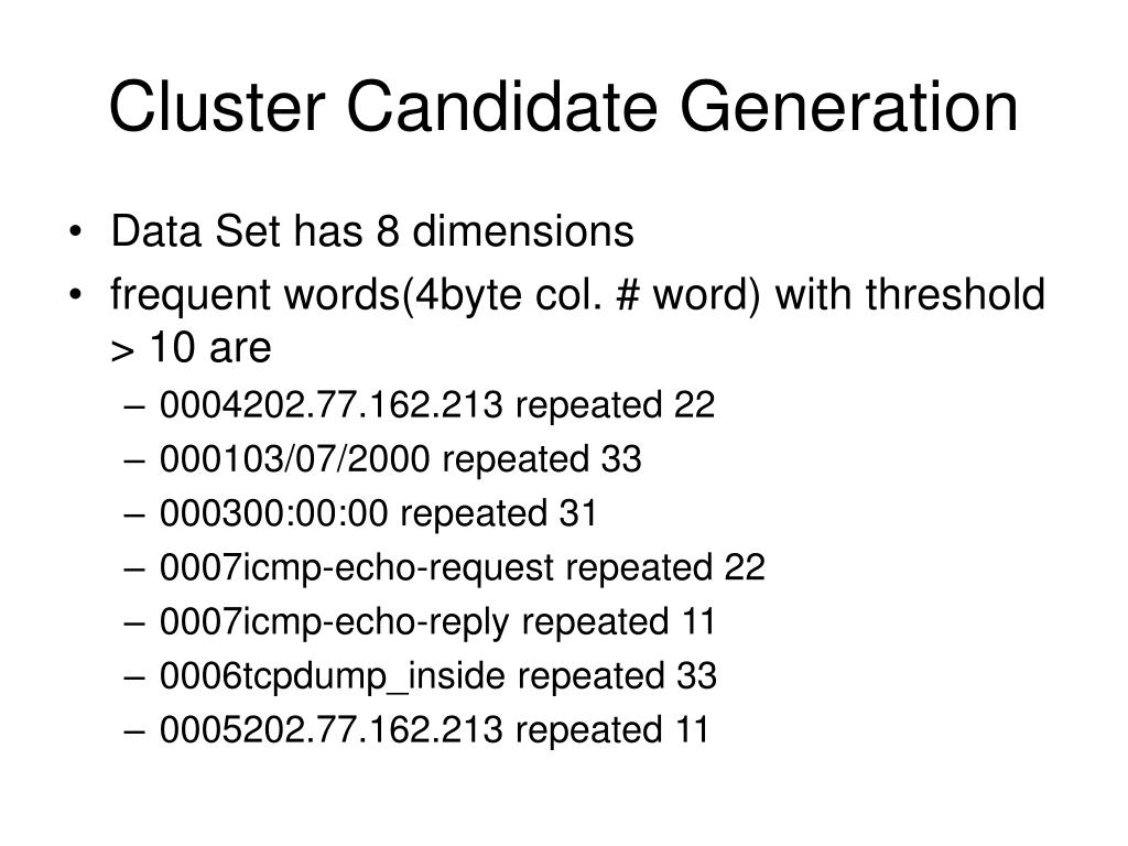 Cluster Candidate Generation • Data Set has 8 dimensions • frequent words(4byte col. # word) with threshold > 10 are • 0004202.77.162.213 repeated 22 • 000103/07/2000 repeated 33 • 000300:00:00 repeated 31 • 0007icmp-echo-request repeated 22 • 0007icmp-echo-reply repeated 11 • 0006tcpdump_inside repeated 33 • 0005202.77.162.213 repeated 11