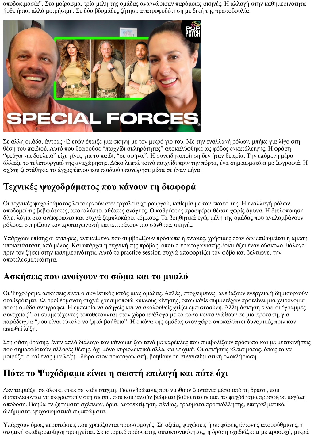 αποδοκιμασία”. Στο μοίρασμα, τρία μέλη της ομάδας αναγνώρισαν παρόμοιες σκηνές. Η αλλαγή στην καθημερινότητα ήρθε ήπια, αλλά μετρήσιμη. Σε δύο βδομάδες ζήτησε ανατροφοδότηση με δική της πρωτοβουλία. Σε άλλη ομάδα, άντρας 42 ετών έπαιξε μια σκηνή με τον μικρό γιο του. Με την εναλλαγή ρόλων, μπήκε για λίγο στη θέση του παιδιού. Αυτό που θεωρούσε “παιχνίδι σκληρότητας” αποκαλύφθηκε ως φόβος εγκατάλειψης. Η φράση “φεύγω για δουλειά” είχε γίνει, για το παιδί, “σε αφήνω”. Η συνειδητοποίηση δεν ήταν θεωρία. Την επόμενη μέρα άλλαξε το τελετουργικό της αναχώρησης. Δέκα λεπτά κοινό παιχνίδι πριν την πόρτα, ένα σημειωματάκι με ζωγραφιά. Η σχέση ζεστάθηκε, το άγχος ύπνου του παιδιού υποχώρησε μέσα σε έναν μήνα. Τεχνικές ψυχοδράματος που κάνουν τη διαφορά Οι τεχνικές ψυχοδράματος λειτουργούν σαν εργαλεία χειρουργού, καθεμία με τον σκοπό της. Η εναλλαγή ρόλων αποδομεί τις βεβαιότητες, αποκαλύπτει αθέατες ανάγκες. Ο καθρέφτης προσφέρει θέαση χωρίς άμυνα. Η διπλοποίηση δίνει λόγια στο ανέκφραστο και συχνά ξεμπλοκάρει κόμπους. Τα βοηθητικά εγώ, μέλη της ομάδας που αναλαμβάνουν ρόλους, στηρίζουν τον πρωταγωνιστή και επιτρέπουν πιο σύνθετες σκηνές. Υπάρχουν επίσης οι άγκυρες, αντικείμενα που συμβολίζουν πρόσωπα ή έννοιες, χρήσιμες όταν δεν επιθυμείται η άμεση υποκατάσταση από μέλος. Και υπάρχει η τεχνική της πρόβας, όπου ο πρωταγωνιστής δοκιμάζει έναν δύσκολο διάλογο πριν τον ζήσει στην καθημερινότητα. Αυτό το practice session συχνά αποφορτίζει τον φόβο και βελτιώνει την αποτελεσματικότητα. Ασκήσεις που ανοίγουν το σώμα και το μυαλό Οι Ψυχόδραμα ασκήσεις είναι ο συνδετικός ιστός μιας ομάδας. Απλές, στοχευμένες, ανεβάζουν ενέργεια ή δημιουργούν σταθερότητα. Σε προθέρμανση συχνά χρησιμοποιώ κύκλους κίνησης, όπου κάθε συμμετέχων προτείνει μια χειρονομία που η ομάδα αντιγράφει. Η εμπειρία να οδηγείς και να ακολουθείς χτίζει εμπιστοσύνη. Άλλη άσκηση είναι οι “γραμμές συνέχειας”: οι συμμετέχοντες τοποθετούνται στον χώρο ανάλογα με το πόσο κοντά νιώθουν σε μια πρόταση, για παράδειγμα “μου είναι εύκολο να ζητώ βοήθεια”. Η εικόνα της ομάδας στον χώρο αποκαλύπτει δυναμικές πριν καν ειπωθεί λέξη. Στη φάση δράσης, έναν απλό διάλογο τον κάνουμε ζωντανό με καρέκλες που συμβολίζουν πρόσωπα και με μετακινήσεις που σηματοδοτούν αλλαγές θέσης, όχι μόνο κυριολεκτικά αλλά και ψυχικά. Οι ασκήσεις κλεισίματος, όπως το να μοιράζει ο καθένας μια λέξη - δώρο στον πρωταγωνιστή, βοηθούν τη συναισθηματική ολοκλήρωση. Πότε το Ψυχόδραμα είναι η σωστή επιλογή και πότε όχι Δεν ταιριάζει σε όλους, ούτε σε κάθε στιγμή. Για ανθρώπους που νιώθουν ζωντάνια μέσα από τη δράση, που δυσκολεύονται να εκφραστούν στη σιωπή, που κουβαλούν βιώματα βαθιά στο σώμα, το ψυχόδραμα προσφέρει μεγάλη απόδοση. Βοηθά σε ζητήματα σχέσεων, όρια, αυτοεκτίμηση, πένθος, τραύματα προσκόλλησης, επαγγελματικά διλήμματα, ψυχοσωματικά συμπτώματα. Υπάρχουν όμως περιπτώσεις που χρειάζονται προσαρμογές. Σε οξείες ψυχώσεις ή σε φάσεις έντονης απορρύθμισης, η ατομική σταθεροποίηση προηγείται. Σε ιστορικό πρόσφατης αυτοκτονικότητας, η δράση σχεδιάζεται με προσοχή, μικρά