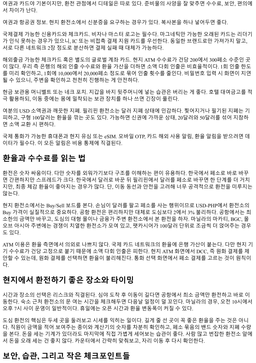 여권과카드야기본이지만, 환전관점에서디테일은따로있다. 준비물의사양을잘맞추면수수료, 보안, 편의에 서차이가난다. 여권과항공권정보. 현지환전소에서신분증을요구하는경우가있다. 복사본을하나넣어두면좋다. 국제결제가능한신용카드와체크카드. 비자나마스터로고는필수다. 마그네틱만가능한오래된카드는리더기 가인식못하는경우가있으니, IC 또는비접촉결제지원카드를우선한다. 동일한브랜드로만가져가지말고, 서로다른네트워크 2장정도로분산하면결제실패때대체가가능하다. 해외출금가능한체크카드혹은별도의글로벌계좌카드. 현지 ATM 수수료가건당 200에서 300페소수준인곳 이많다. 우리측은행의해외인출수수료와환율가산을더하면소액다회인출은비효율적이다. 1회인출한도 를미리확인하고, 1회에 10,000에서 20,000페소정도로묶어인출횟수를줄인다. 비밀번호입력시화면이지연 될수있으니, 주변을확인하고천천히진행하는게안전하다. 현금보관용머니벨트또는네크포치. 지갑을바지뒷주머니에넣는습관은버리는게좋다. 호텔대여금고를적 극활용하되, 이동중에는몸에밀착되는보관장치를하나쓰면긴장이풀린다. 여분의 USD 소액권과깨끗한지폐. 필리핀환전소는달러지폐상태에민감하다. 찢어지거나필기된지폐는기 피하고, 구형 100달러는환율을깎는곳도있다. 가능하면신권에가까운상태, 20달러와 50달러를섞어지참하 면소액교환시편하다. 국제통화가가능한휴대폰과현지유심또는 eSIM. 모바일 OTP, 카드해외사용알림, 환율알림을받으려면데 이터가필수다. 이모든알림은비용통제에직결된다. 환율과수수료를읽는법 환전은숫자싸움이다. 다만숫자를외워가기보다구조를이해하는편이유용하다. 한국에서페소로바로바꾸 면간편하지만스프레드가크다. 한국에서달러로바꾼뒤필리핀에서달러를페소로바꾸면한단계를더거치 지만, 최종체감환율이좋아지는경우가많다. 단, 이동동선과안전을고려해너무공격적으로환전을미루지는 않는다. 현지환전소에서는 Buy/Sell 보드를본다. 손님이달러를팔고페소를사는행위이므로 USD-PHP에서환전소의 Buy 가격이실질적으로중요하다. 공항환전은편리하지만대체로도심보다 2에서 3% 불리하다. 공항에서는최 소한의금액만바꾸고, 도심의대형몰이나금융가주변환전소에서본환전을하자. 마닐라의마카티, BGC, 몰 오브아시아주변에는경쟁이치열한환전소가모여있고, 팻카시어가 100달러단위로조금씩더얹어주는경우 도있다. ATM 이용은환율측면에서의외로나쁘지않다. 국제카드네트워크의환율에은행가산이붙는다. 다만현지기 기수수료가건당고정으로붙기때문에소액다회인출은피한다. 현지 ATM 화면에서 DCC, 즉원화결제를제 안할수있는데, 원화결제를선택하면환율이불리해진다. 통화선택화면에서페소결제를고르는것이원칙이 다. 현지에서환전하기좋은장소와타이밍 시간과장소의선택은리스크와직결된다. 심야도착후이동이길다면공항에서최소금액만환전하고바로이 동한다. 숙소근처환전소의문여는시간을체크해두면다음날일정이덜꼬인다. 마닐라의경우, 오전 10시에서 오후 7시사이운영이일반적이다. 휴일에는오픈시간과환율변동폭이커질수있다. 도심환전의핵심은두세곳을둘러보고시세를익히는일이다. 길게줄선곳이꼭좋은환율을주는것은아니 다. 직원이금액을적어보여주는종이와계산기의숫자를차분히확인하고, 페소묶음의밴드숫자와지폐수량 을본다. 돈을세는기계가있더라도마지막에직접가볍게세어보는습관이좋다. 사람많고번잡한환전소앞에 서돈을오래세는건좋지않다. 카운터에서간략히맞춰보고, 자리이동후다시확인한다. 보안, 습관, 그리고작은체크포인트들