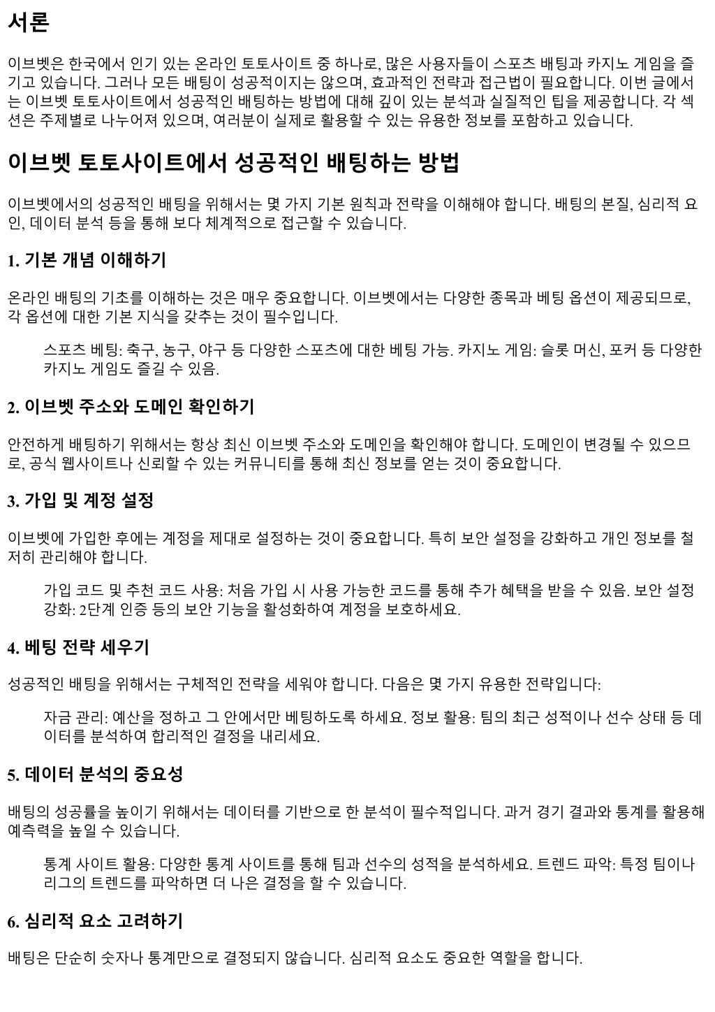 1. 서론 이브벳은한국에서인기있는온라인토토사이트중하나로, 많은사용자들이스포츠배팅과카지노게임을즐 기고있습니다. 그러나모든배팅이성공적이지는않으며, 효과적인전략과접근법이필요합니다. 이번글에서 는이브벳토토사이트에서성공적인배팅하는방법에대해깊이있는분석과실질적인팁을제공합니다. 각섹 션은주제별로나누어져있으며, 여러분이실제로활용할수있는유용한정보를포함하고있습니다. 이브벳토토사이트에서성공적인배팅하는방법 이브벳에서의성공적인배팅을위해서는몇가지기본원칙과전략을이해해야합니다. 배팅의본질, 심리적요 인, 데이터분석등을통해보다체계적으로접근할수있습니다. 1. 기본개념이해하기 온라인배팅의기초를이해하는것은매우중요합니다. 이브벳에서는다양한종목과베팅옵션이제공되므로, 각옵션에대한기본지식을갖추는것이필수입니다. 스포츠베팅: 축구, 농구, 야구등다양한스포츠에대한베팅가능. 카지노게임: 슬롯머신, 포커등다양한 카지노게임도즐길수있음. 2. 이브벳주소와도메인확인하기 안전하게배팅하기위해서는항상최신이브벳주소와도메인을확인해야합니다. 도메인이변경될수있으므 로, 공식웹사이트나신뢰할수있는커뮤니티를통해최신정보를얻는것이중요합니다. 3. 가입및계정설정 이브벳에가입한후에는계정을제대로설정하는것이중요합니다. 특히보안설정을강화하고개인정보를철 저히관리해야합니다. 가입코드및추천코드사용: 처음가입시사용가능한코드를통해추가혜택을받을수있음. 보안설정 강화: 2단계인증등의보안기능을활성화하여계정을보호하세요. 4. 베팅전략세우기 성공적인배팅을위해서는구체적인전략을세워야합니다. 다음은몇가지유용한전략입니다: 자금관리: 예산을정하고그안에서만베팅하도록하세요. 정보활용: 팀의최근성적이나선수상태등데 이터를분석하여합리적인결정을내리세요. 5. 데이터분석의중요성 배팅의성공률을높이기위해서는데이터를기반으로한분석이필수적입니다. 과거경기결과와통계를활용해 예측력을높일수있습니다. 통계사이트활용: 다양한통계사이트를통해팀과선수의성적을분석하세요. 트렌드파악: 특정팀이나 리그의트렌드를파악하면더나은결정을할수있습니다. 6. 심리적요소고려하기 배팅은단순히숫자나통계만으로결정되지않습니다. 심리적요소도중요한역할을합니다.