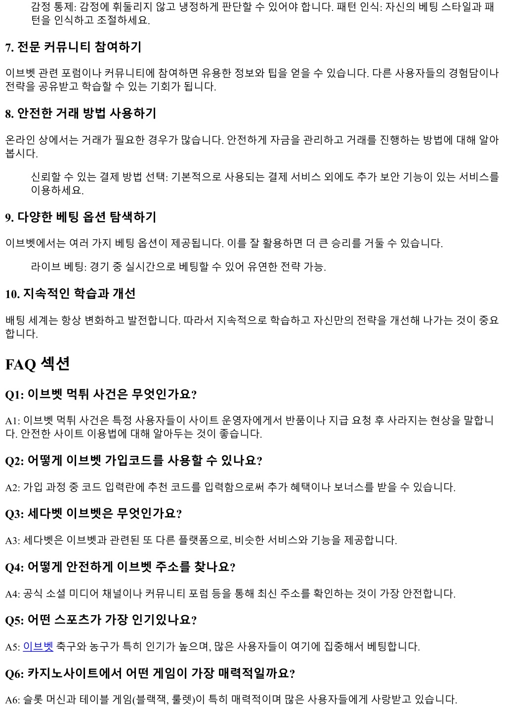 2. 감정통제: 감정에휘둘리지않고냉정하게판단할수있어야합니다. 패턴인식: 자신의베팅스타일과패 턴을인식하고조절하세요. 7. 전문커뮤니티참여하기 이브벳관련포럼이나커뮤니티에참여하면유용한정보와팁을얻을수있습니다. 다른사용자들의경험담이나 전략을공유받고학습할수있는기회가됩니다. 8. 안전한거래방법사용하기 온라인상에서는거래가필요한경우가많습니다. 안전하게자금을관리하고거래를진행하는방법에대해알아 봅시다. 신뢰할수있는결제방법선택: 기본적으로사용되는결제서비스외에도추가보안기능이있는서비스를 이용하세요. 9. 다양한베팅옵션탐색하기 이브벳에서는여러가지베팅옵션이제공됩니다. 이를잘활용하면더큰승리를거둘수있습니다. 라이브베팅: 경기중실시간으로베팅할수있어유연한전략가능. 10. 지속적인학습과개선 배팅세계는항상변화하고발전합니다. 따라서지속적으로학습하고자신만의전략을개선해나가는것이중요 합니다. FAQ 섹션 Q1: 이브벳먹튀사건은무엇인가요? A1: 이브벳먹튀사건은특정사용자들이사이트운영자에게서반품이나지급요청후사라지는현상을말합니 다. 안전한사이트이용법에대해알아두는것이좋습니다. Q2: 어떻게이브벳가입코드를사용할수있나요? A2: 가입과정중코드입력란에추천코드를입력함으로써추가혜택이나보너스를받을수있습니다. Q3: 세다벳이브벳은무엇인가요? A3: 세다벳은이브벳과관련된또다른플랫폼으로, 비슷한서비스와기능을제공합니다. Q4: 어떻게안전하게이브벳주소를찾나요? A4: 공식소셜미디어채널이나커뮤니티포럼등을통해최신주소를확인하는것이가장안전합니다. Q5: 어떤스포츠가가장인기있나요? A5: 이브벳축구와농구가특히인기가높으며, 많은사용자들이여기에집중해서베팅합니다. Q6: 카지노사이트에서어떤게임이가장매력적일까요? A6: 슬롯머신과테이블게임(블랙잭, 룰렛)이특히매력적이며많은사용자들에게사랑받고있습니다.
