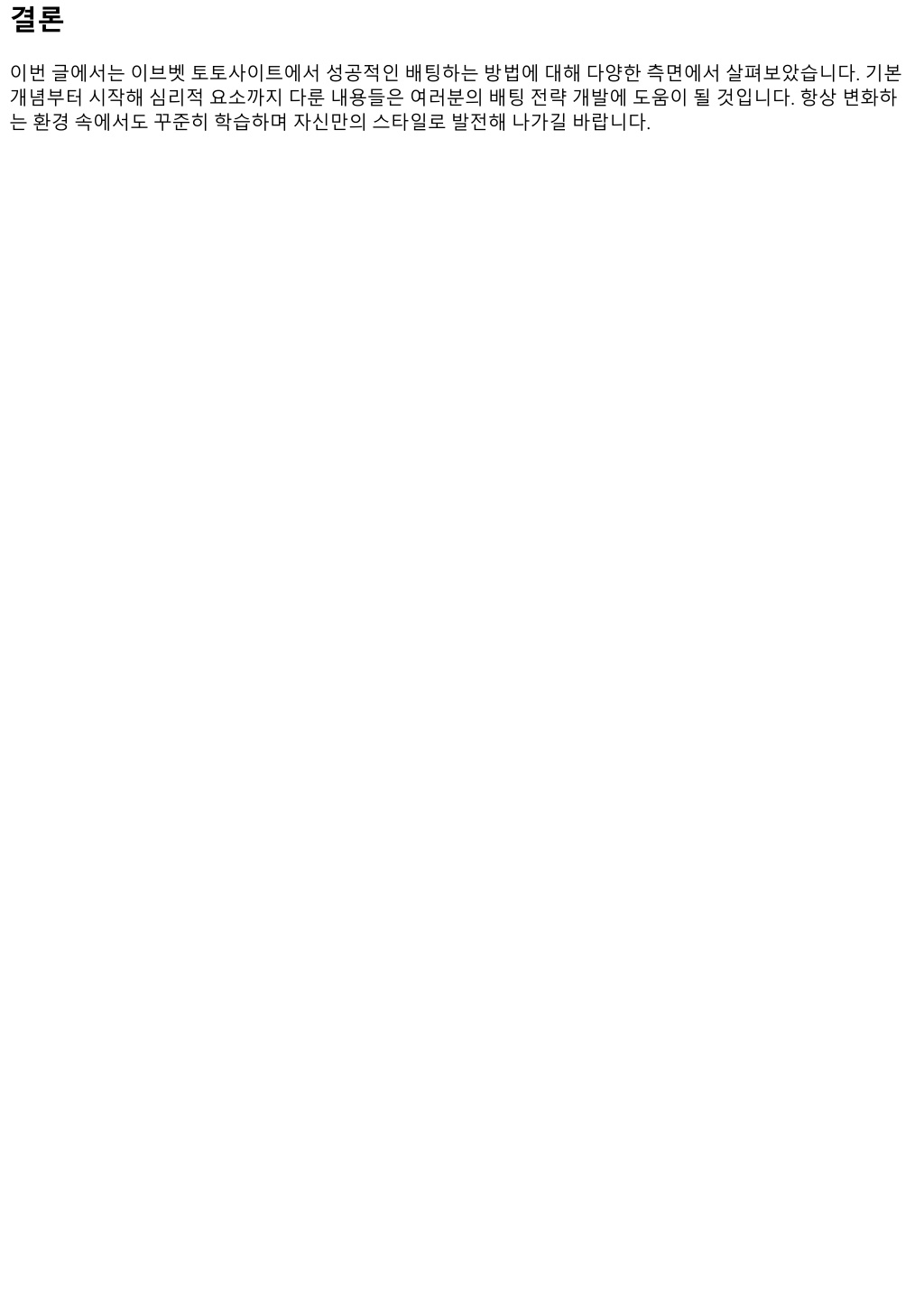 3. 결론 이번글에서는이브벳토토사이트에서성공적인배팅하는방법에대해다양한측면에서살펴보았습니다. 기본 개념부터시작해심리적요소까지다룬내용들은여러분의배팅전략개발에도움이될것입니다. 항상변화하 는환경속에서도꾸준히학습하며자신만의스타일로발전해나가길바랍니다.