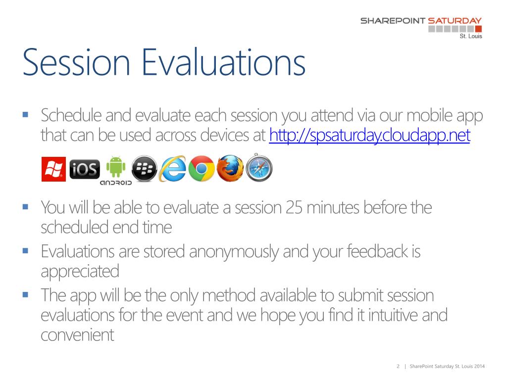 Attend and evaluate each session at SharePoint Saturday St. Louis using our intuitive mobile app! Available across devices at http://spsaturday.cloudapp.net, you can submit your evaluations starting 25 minutes before a session ends. All feedback is anonymous and valued to enhance future events. Remember to follow us on Twitter @spsstlouis, use #spsstl, and don’t miss out on “Sponsor Bingo” for a chance to win exciting prizes. Your participation makes the event better for everyone!