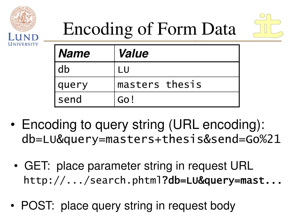 Encoding of Form Data • Encoding to query string (URL encoding):db=LU&query=masters+thesis&send=Go%21 • GET: place parameter string in request URLhttp://.../search.phtml?db=LU&query=mast... • POST: place query string in request body