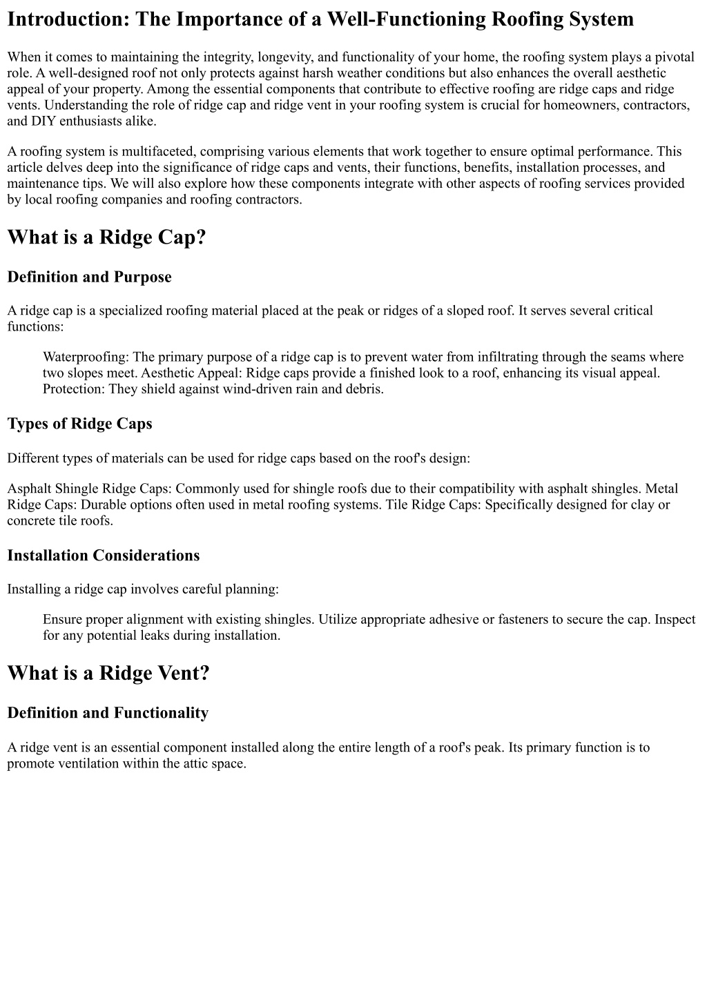 Introduction: The Importance of a Well-Functioning Roofing System When it comes to maintaining the integrity, longevity, and functionality of your home, the roofing system plays a pivotal role. A well-designed roof not only protects against harsh weather conditions but also enhances the overall aesthetic appeal of your property. Among the essential components that contribute to effective roofing are ridge caps and ridge vents. Understanding the role of ridge cap and ridge vent in your roofing system is crucial for homeowners, contractors, and DIY enthusiasts alike. A roofing system is multifaceted, comprising various elements that work together to ensure optimal performance. This article delves deep into the significance of ridge caps and vents, their functions, benefits, installation processes, and maintenance tips. We will also explore how these components integrate with other aspects of roofing services provided by local roofing companies and roofing contractors. What is a Ridge Cap? Definition and Purpose A ridge cap is a specialized roofing material placed at the peak or ridges of a sloped roof. It serves several critical functions: Waterproofing: The primary purpose of a ridge cap is to prevent water from infiltrating through the seams where two slopes meet. Aesthetic Appeal: Ridge caps provide a finished look to a roof, enhancing its visual appeal. Protection: They shield against wind-driven rain and debris. Types of Ridge Caps Different types of materials can be used for ridge caps based on the roof's design: Asphalt Shingle Ridge Caps: Commonly used for shingle roofs due to their compatibility with asphalt shingles. Metal Ridge Caps: Durable options often used in metal roofing systems. Tile Ridge Caps: Specifically designed for clay or concrete tile roofs. Installation Considerations Installing a ridge cap involves careful planning: Ensure proper alignment with existing shingles. Utilize appropriate adhesive or fasteners to secure the cap. Inspect for any potential leaks during installation. What is a Ridge Vent? Definition and Functionality A ridge vent is an essential component installed along the entire length of a roof's peak. Its primary function is to promote ventilation within the attic space.