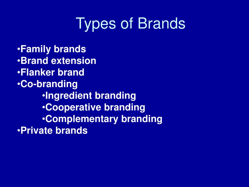 Types of Brands • Family brands • Brand extension • Flanker brand • Co-branding • Ingredient branding • Cooperative branding • Complementary branding • Private brands