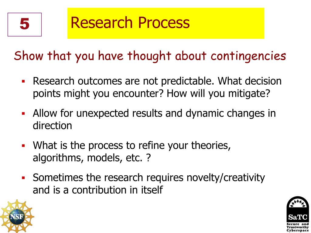 Research Process 5 Show that you have thought about contingencies • Research outcomes are not predictable. What decision points might you encounter? How will you mitigate? • Allow for unexpected results and dynamic changes in direction • What is the process to refine your theories, algorithms, models, etc. ? • Sometimes the research requires novelty/creativity and is a contribution in itself