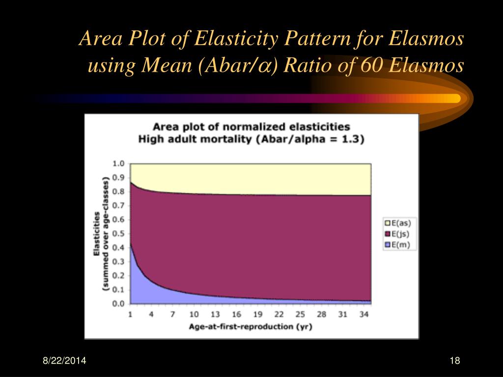 A Potential Problem and Proposed Solution for Elasmos • Catch 22 situation if we’d like to estimate the E-pattern of an Elasmo at the Rio Negro Beach? • If Abar/alpha were roughly constant, we could estimate Abar from the mean ratio and the elasticity pattern could be easily estimated without the need to solve the characteristic equation. • Example: = 7 yr, Abar/ ~ 1.3, thus Abar ~ 9 yr:E(m) normalized = 1/(Abar + 1) = 1/10 = 10%E(juvenile survival) = * E(m) = 7 * 10% = 70%E(adult survival) = 20% (from sum = 100%)