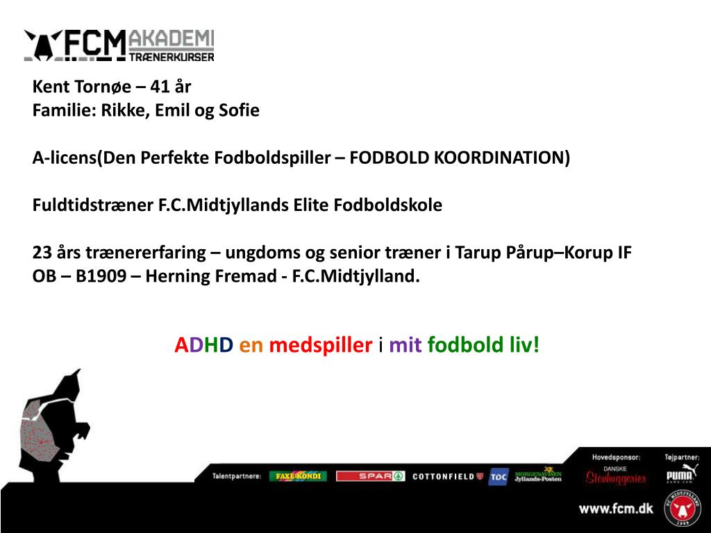 Kent Tornøe – 41 år Familie: Rikke, Emil og Sofie A-licens(Den Perfekte Fodboldspiller – FODBOLD KOORDINATION) Fuldtidstræner F.C.MidtjyllandsElite Fodboldskole 23 års trænererfaring – ungdoms og senior træner i Tarup Pårup–Korup IF OB – B1909 – Herning Fremad - F.C.Midtjylland. ADHDenmedspiller imitfodbold liv!