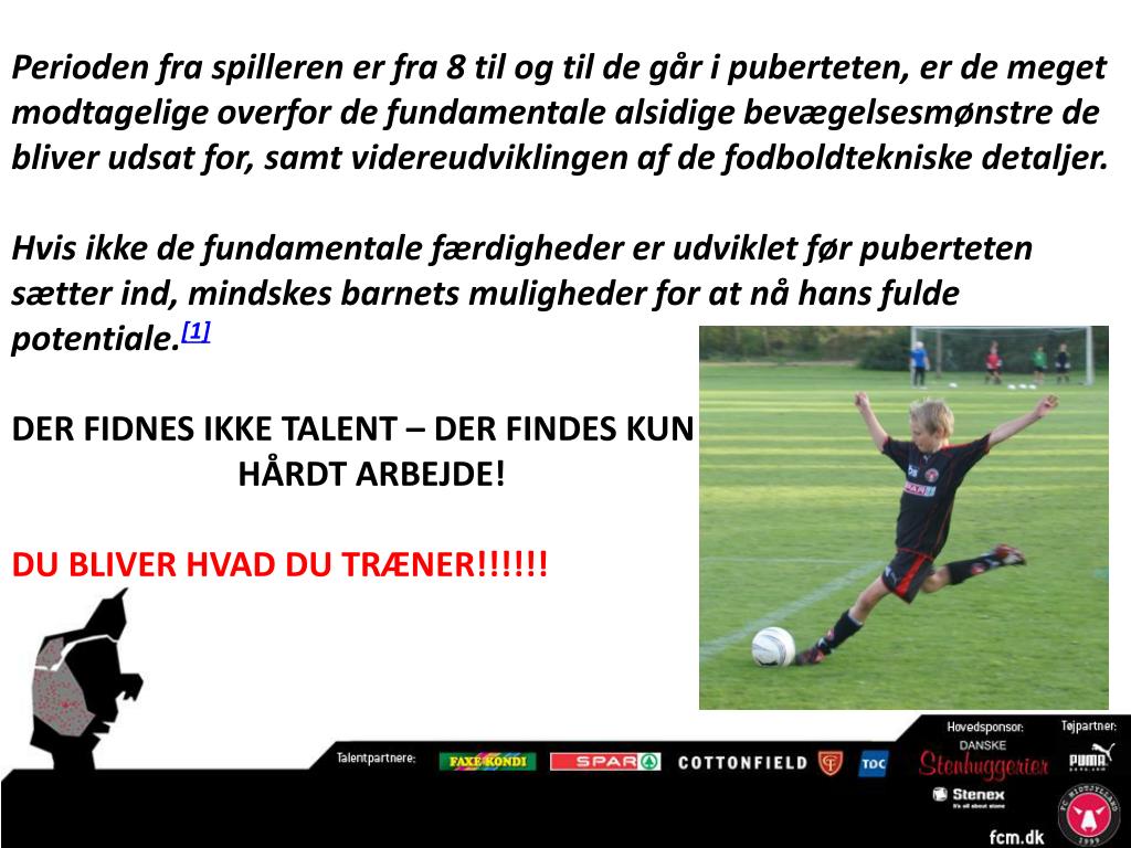 Perioden fra spilleren er fra 8 til og til de går i puberteten, er de meget modtagelige overfor de fundamentale alsidige bevægelsesmønstre de bliver udsat for, samt videreudviklingen af de fodboldtekniske detaljer. Hvis ikke de fundamentale færdigheder er udviklet før puberteten sætter ind, mindskes barnets muligheder for at nå hans fulde potentiale.[1] DER FIDNES IKKE TALENT – DER FINDES KUN HÅRDT ARBEJDE! DU BLIVER HVAD DU TRÆNER!!!!!!