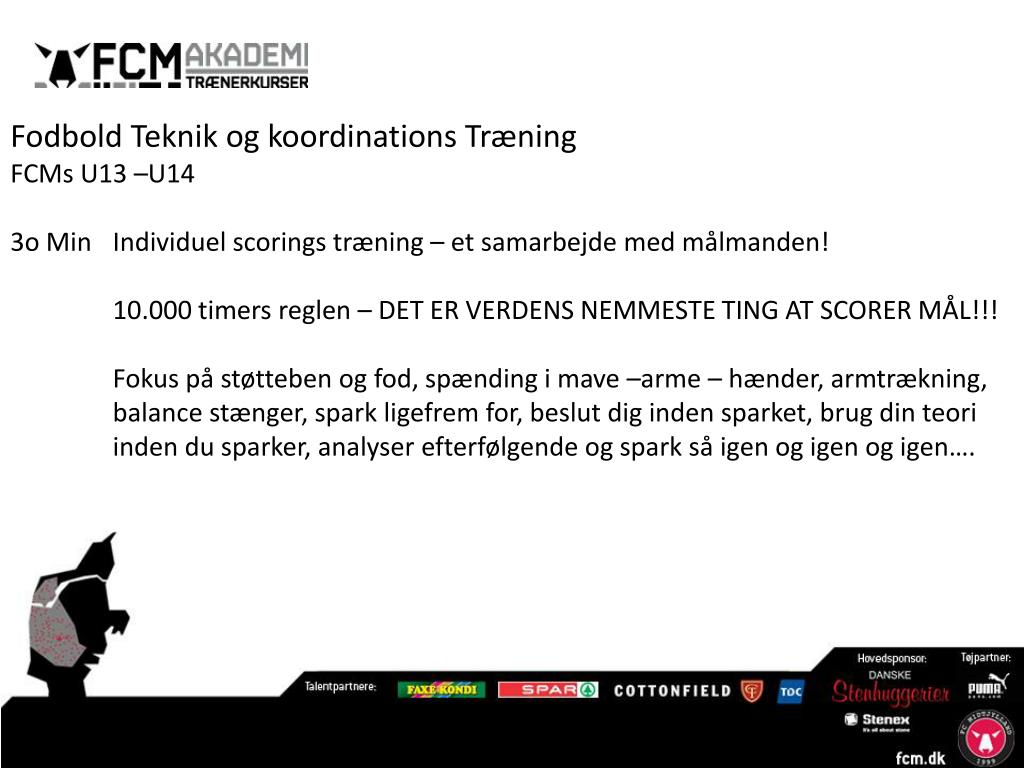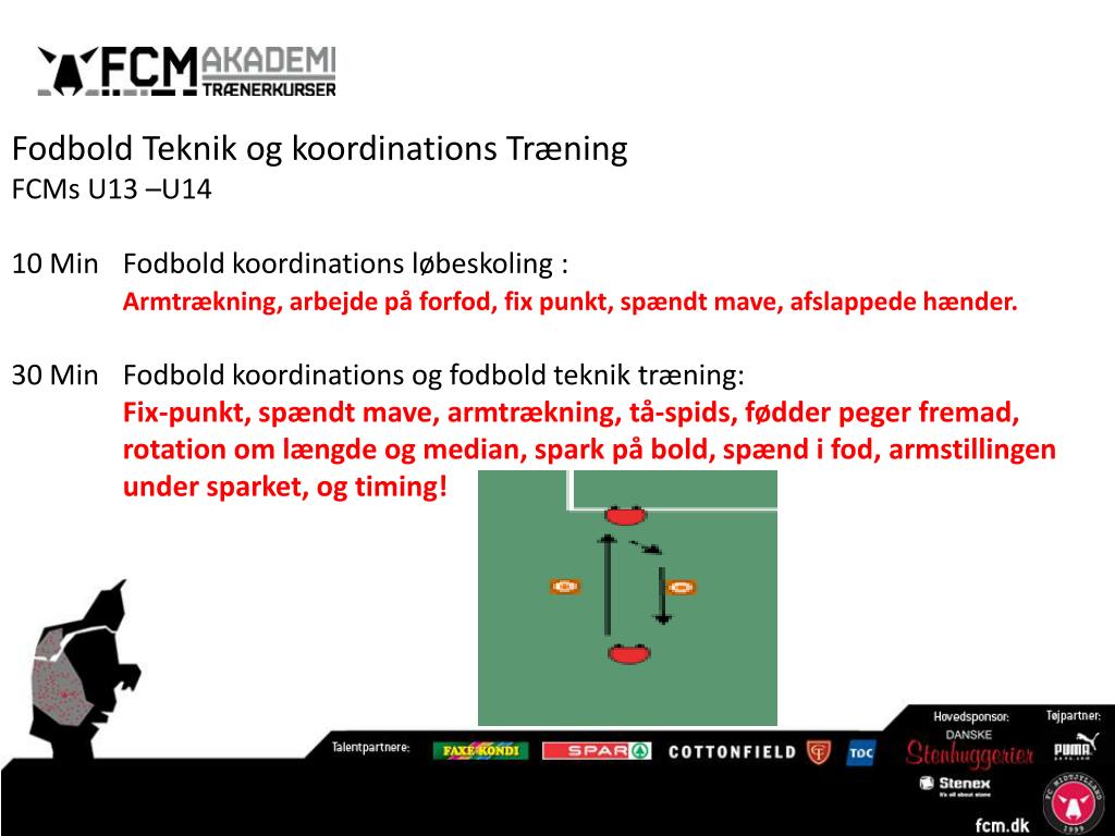 Fodbold Teknik og koordinations Træning FCMs U13 –U14 10 Min Fodbold koordinations løbeskoling : Armtrækning, arbejde på forfod, fix punkt, spændt mave, afslappede hænder. 30 Min Fodbold koordinations og fodbold teknik træning: Fix-punkt, spændt mave, armtrækning, tå-spids, fødder peger fremad, rotation om længde og median, spark på bold, spænd i fod, armstillingen under sparket, og timing!