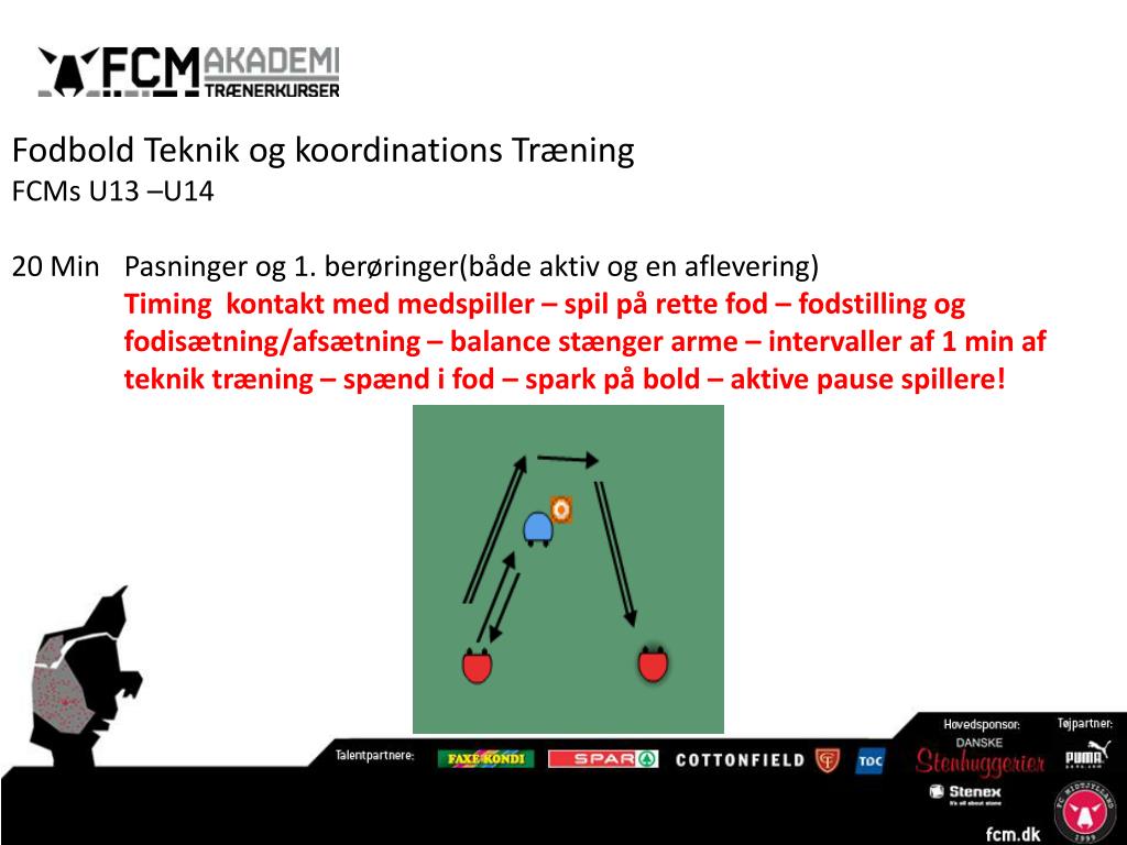 Fodbold Teknik og koordinations Træning FCMs U13 –U14 20 Min Pasninger og 1. berøringer(både aktiv og en aflevering) Timing kontakt med medspiller – spil på rette fod – fodstilling og fodisætning/afsætning – balance stænger arme – intervaller af 1 min af teknik træning – spænd i fod – spark på bold – aktive pause spillere!