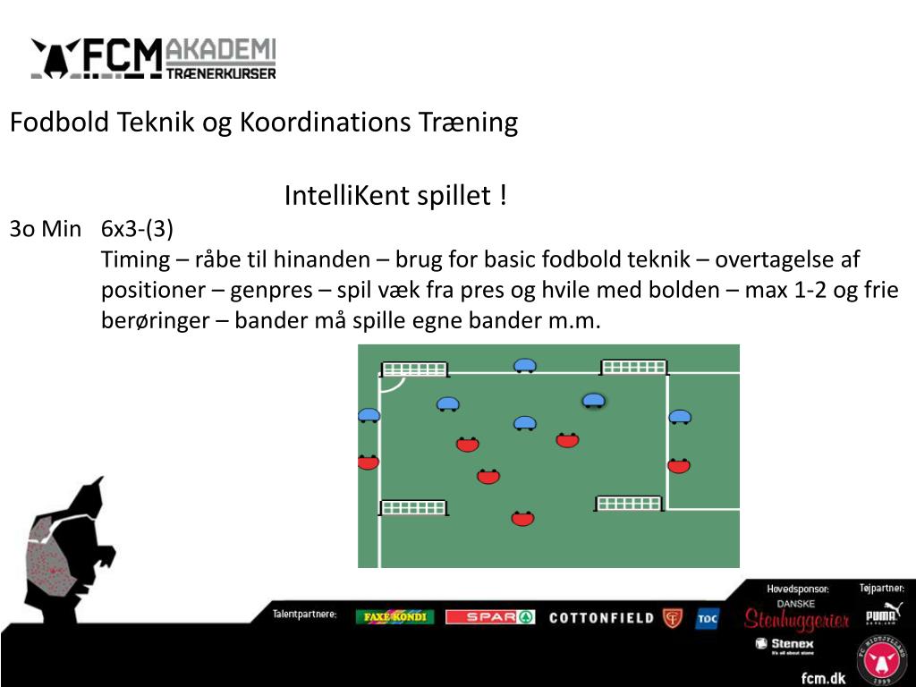 Fodbold Teknik og Koordinations Træning IntelliKent spillet ! 3o Min 6x3-(3) Timing – råbe til hinanden – brug for basic fodbold teknik – overtagelse af positioner – genpres – spil væk fra pres og hvile med bolden – max 1-2 og frie berøringer – bander må spille egne bander m.m.