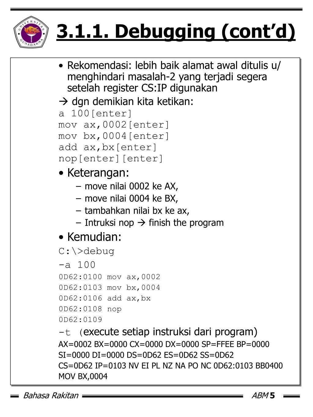 3.1.1. Debugging (cont’d) • Rekomendasi: lebih baik alamat awal ditulis u/ menghindari masalah-2 yang terjadi segera setelah register CS:IP digunakan dgn demikian kita ketikan: a 100[enter] mov ax,0002[enter] mov bx,0004[enter] add ax,bx[enter] nop[enter][enter] • Keterangan: • move nilai 0002 ke AX, • move nilai 0004 ke BX, • tambahkan nilai bx ke ax, • Intruksi nop finish the program • Kemudian: C:\>debug -a 100 0D62:0100 mov ax,0002 0D62:0103 mov bx,0004 0D62:0106 add ax,bx 0D62:0108 nop 0D62:0109 -t (execute setiap instruksi dari program) AX=0002 BX=0000 CX=0000 DX=0000 SP=FFEE BP=0000 SI=0000 DI=0000DS=0D62 ES=0D62 SS=0D62 CS=0D62 IP=0103 NV EI PL NZ NA PO NC0D62:0103 BB0400 MOV BX,0004
