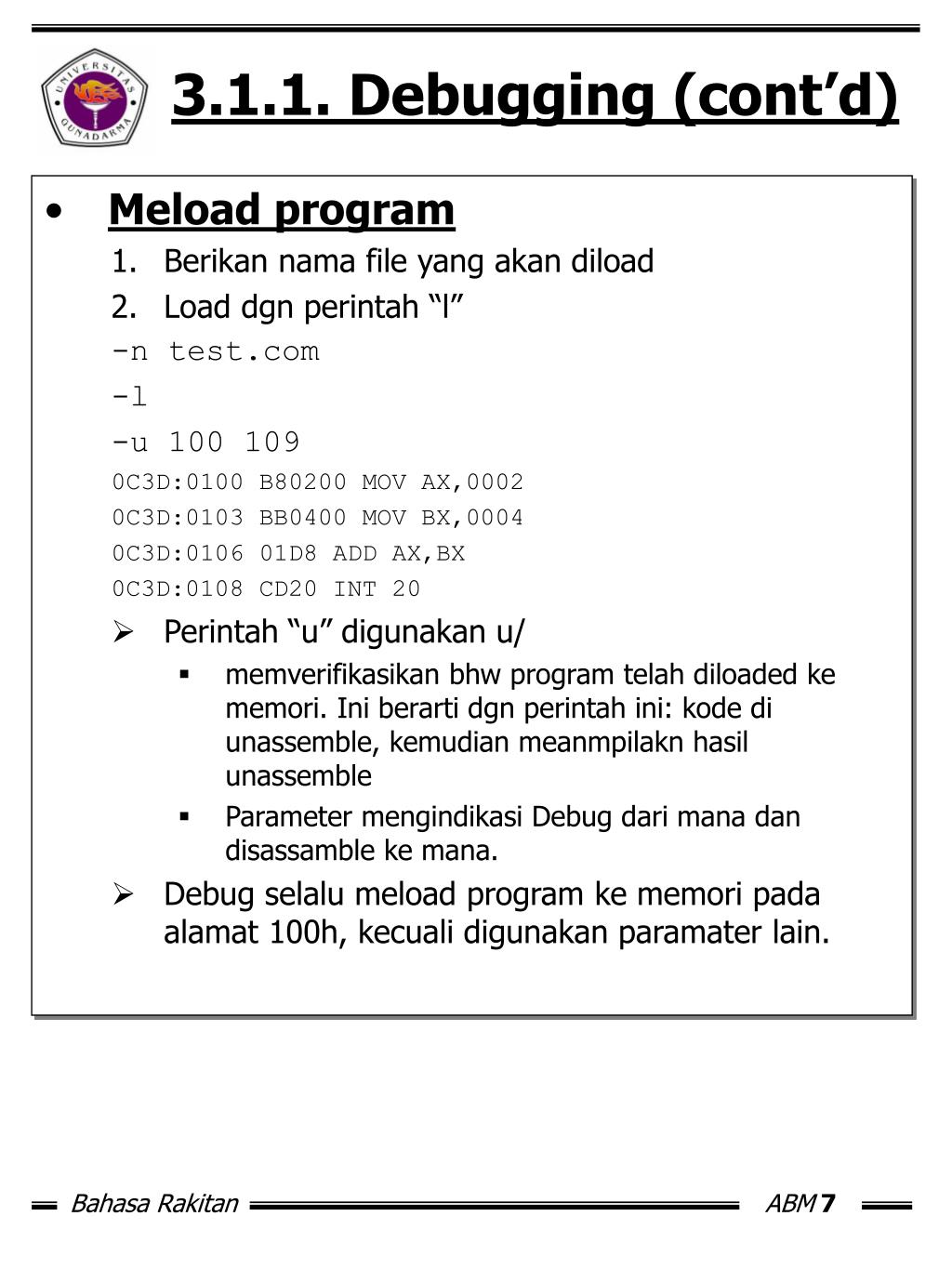 3.1.1. Debugging (cont’d) • Meload program • Berikan nama file yang akan diload • Load dgn perintah “l” -n test.com -l -u 100 109 0C3D:0100 B80200 MOV AX,0002 0C3D:0103 BB0400 MOV BX,0004 0C3D:0106 01D8 ADD AX,BX 0C3D:0108 CD20 INT 20 • Perintah “u” digunakan u/ • memverifikasikan bhw program telah diloaded ke memori. Ini berarti dgn perintah ini: kode di unassemble, kemudian meanmpilakn hasil unassemble • Parameter mengindikasi Debug dari mana dan disassamble ke mana. • Debug selalu meload program ke memori pada alamat 100h, kecuali digunakan paramater lain.