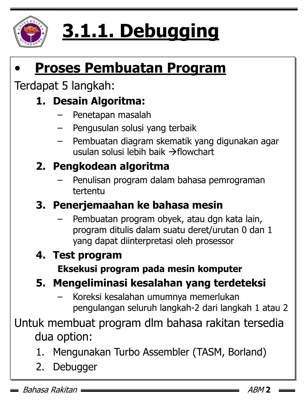 3.1.1. Debugging • Proses Pembuatan Program Terdapat 5 langkah: • Desain Algoritma: • Penetapan masalah • Pengusulan solusi yang terbaik • Pembuatan diagram skematik yang digunakan agar usulan solusi lebih baik flowchart • Pengkodean algoritma • Penulisan program dalam bahasa pemrograman tertentu • Penerjemaahan ke bahasa mesin • Pembuatan program obyek, atau dgn kata lain, program ditulis dalam suatu deret/urutan 0 dan 1 yang dapat diinterpretasi oleh prosessor • Test program Eksekusi program pada mesin komputer • Mengeliminasi kesalahan yang terdeteksi • Koreksi kesalahan umumnya memerlukan pengulangan seluruh langkah-2 dari langkah 1 atau 2 Untuk membuat program dlm bahasa rakitan tersedia dua option: • Mengunakan Turbo Assembler (TASM, Borland) • Debugger
