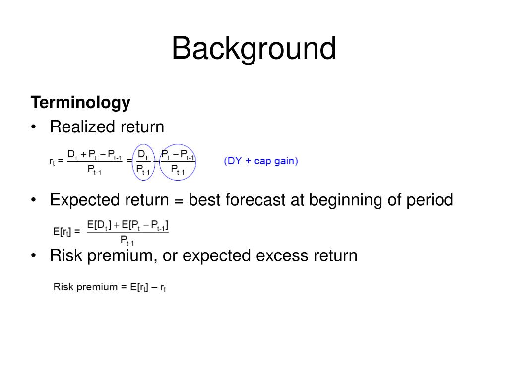 Background Terminology • Realized return • Expected return = best forecast at beginning of period • Risk premium, or expected excess return