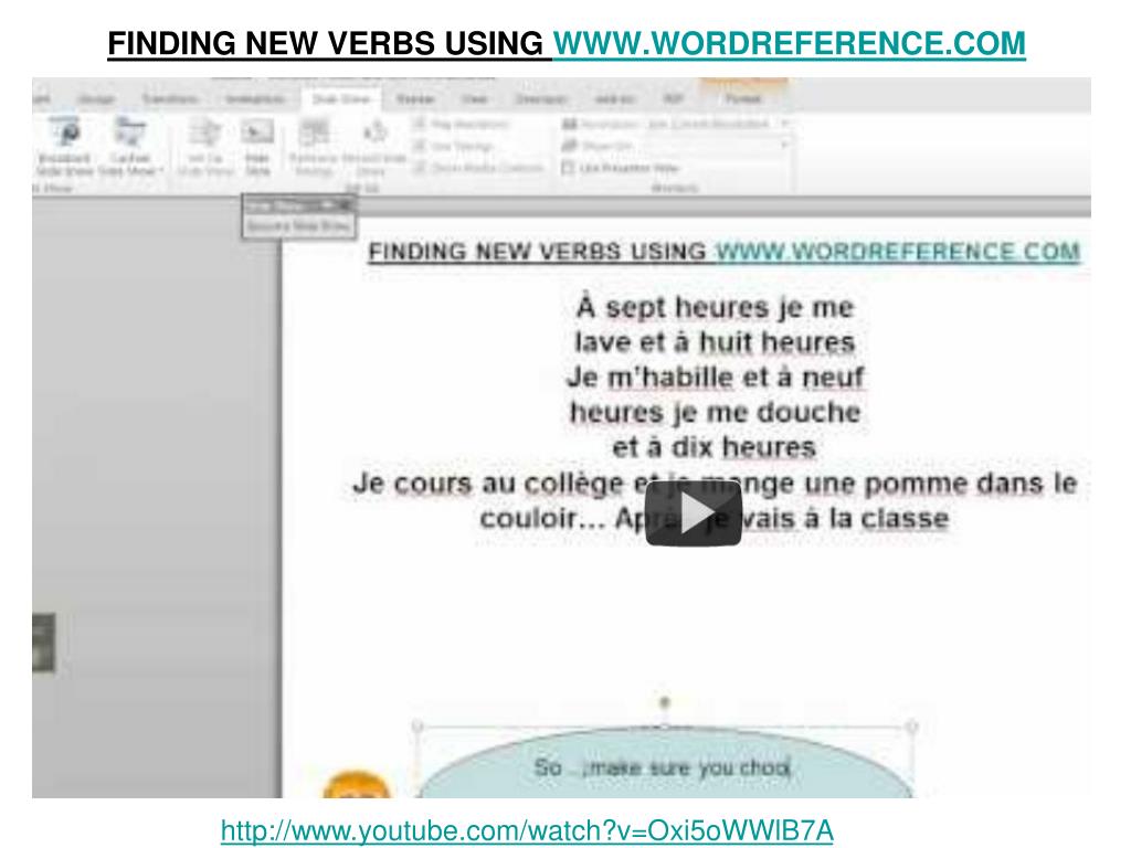FINDING NEW VERBS USING WWW.WORDREFERENCE.COM http://www.youtube.com/watch?v=Oxi5oWWlB7A
