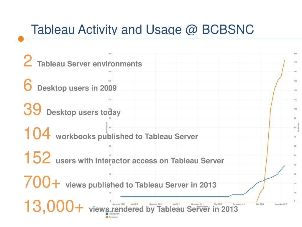 Tableau Activity and Usage @ BCBSNC 2 Tableau Server environments 6 Desktop users in 2009 39 Desktop users today 104 workbooks published to Tableau Server 152 users with interactor access on Tableau Server 700+ views published to Tableau Server in 2013 13,000+ views rendered by Tableau Server in 2013