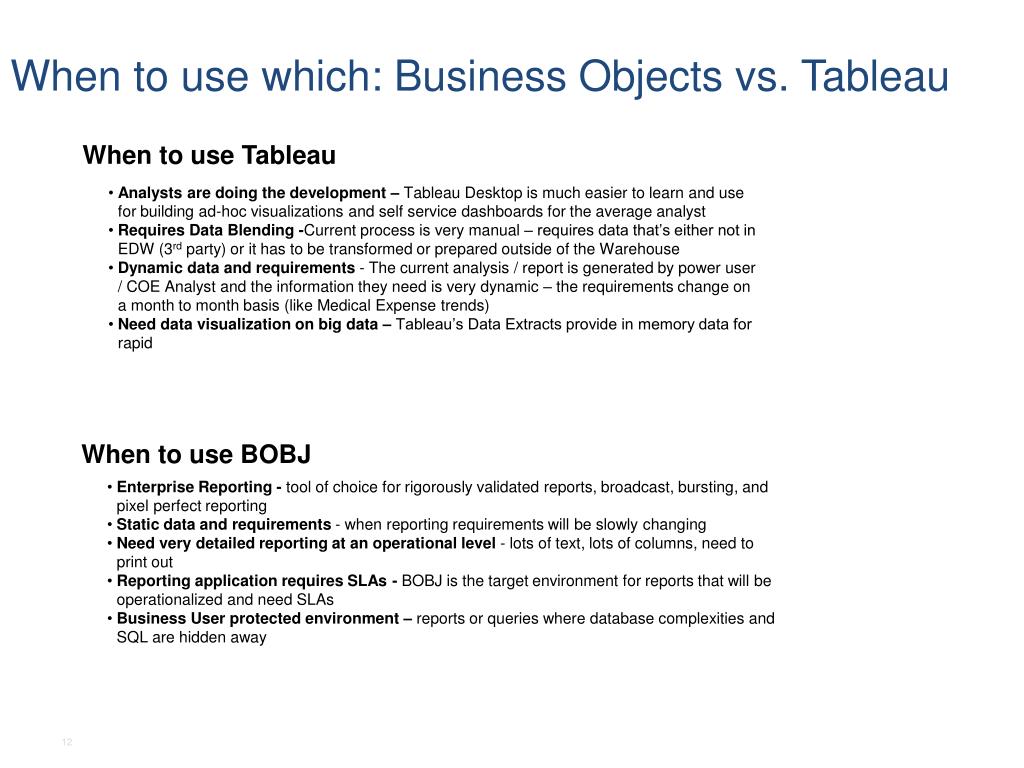 When to use which: Business Objects vs. Tableau When to use Tableau • Analysts are doing the development – Tableau Desktop is much easier to learn and use for building ad-hoc visualizations and self service dashboards for the average analyst • Requires Data Blending -Current process is very manual – requires data that’s either not in EDW (3rd party) or it has to be transformed or prepared outside of the Warehouse • Dynamic data and requirements - The current analysis / report is generated by power user / COE Analyst and the information they need is very dynamic – the requirements change on a month to month basis (like Medical Expense trends) • Need data visualization on big data – Tableau’s Data Extracts provide in memory data for rapid When to use BOBJ • Enterprise Reporting - tool of choice for rigorously validated reports, broadcast, bursting, and pixel perfect reporting • Static data and requirements - when reporting requirements will be slowly changing • Need very detailed reporting at an operational level - lots of text, lots of columns, need to print out • Reporting application requires SLAs - BOBJ is the target environment for reports that will be operationalized and need SLAs • Business User protected environment – reports or queries where database complexities and SQL are hidden away