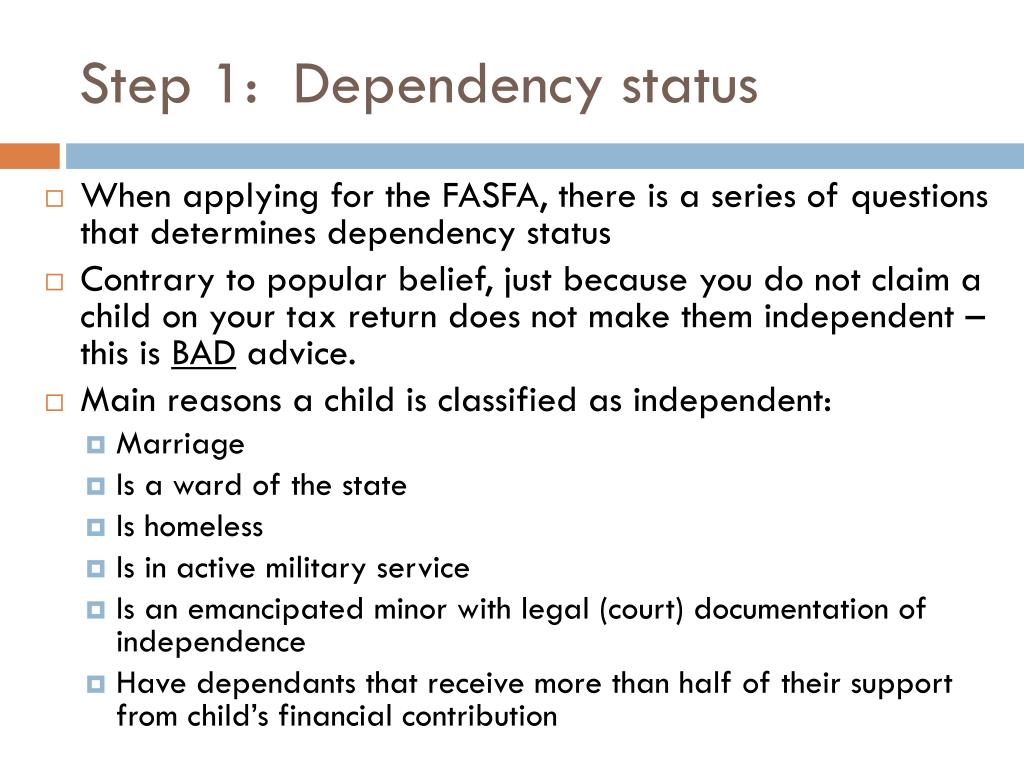 Step 1: Dependency status • When applying for the FASFA, there is a series of questions that determines dependency status • Contrary to popular belief, just because you do not claim a child on your tax return does not make them independent – this is BAD advice. • Main reasons a child is classified as independent: • Marriage • Is a ward of the state • Is homeless • Is in active military service • Is an emancipated minor with legal (court) documentation of independence • Have dependants that receive more than half of their support from child’s financial contribution