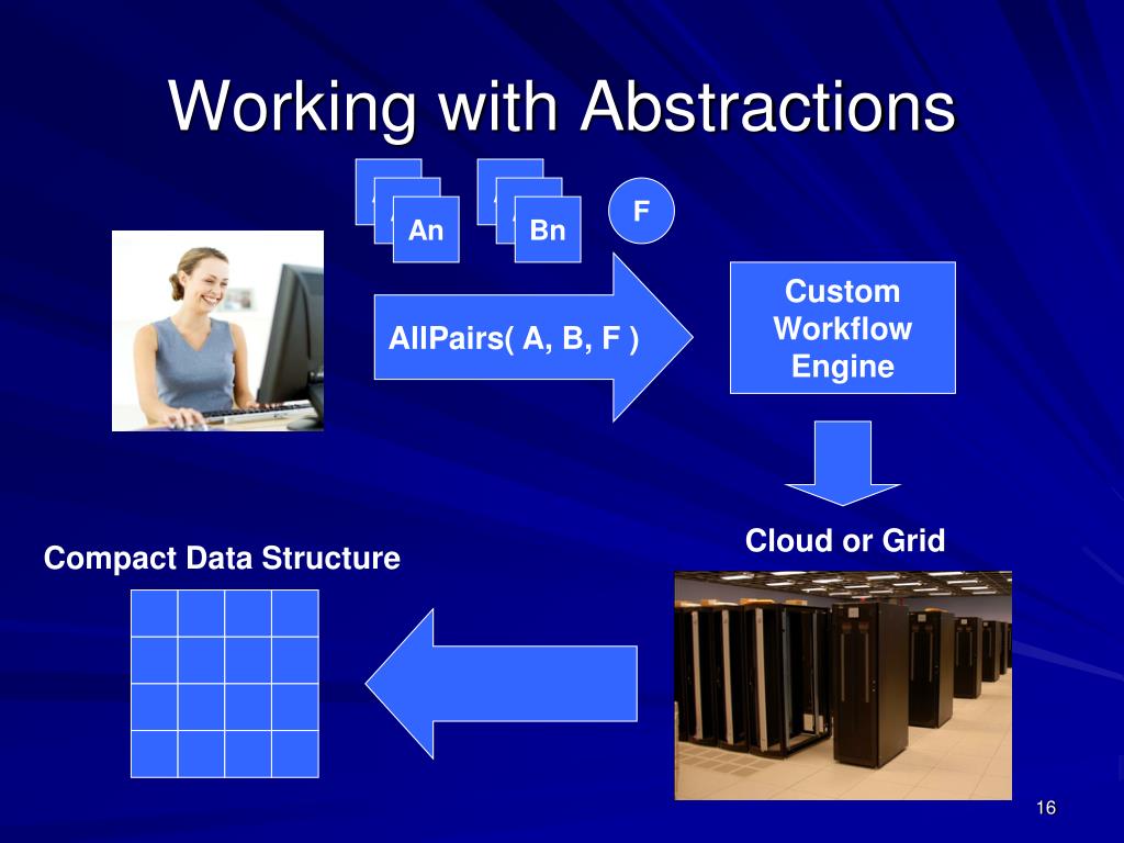 Working with Abstractions A1 A1 A2 A2 F An Bn AllPairs( A, B, F ) Custom Workflow Engine Cloud or Grid Compact Data Structure