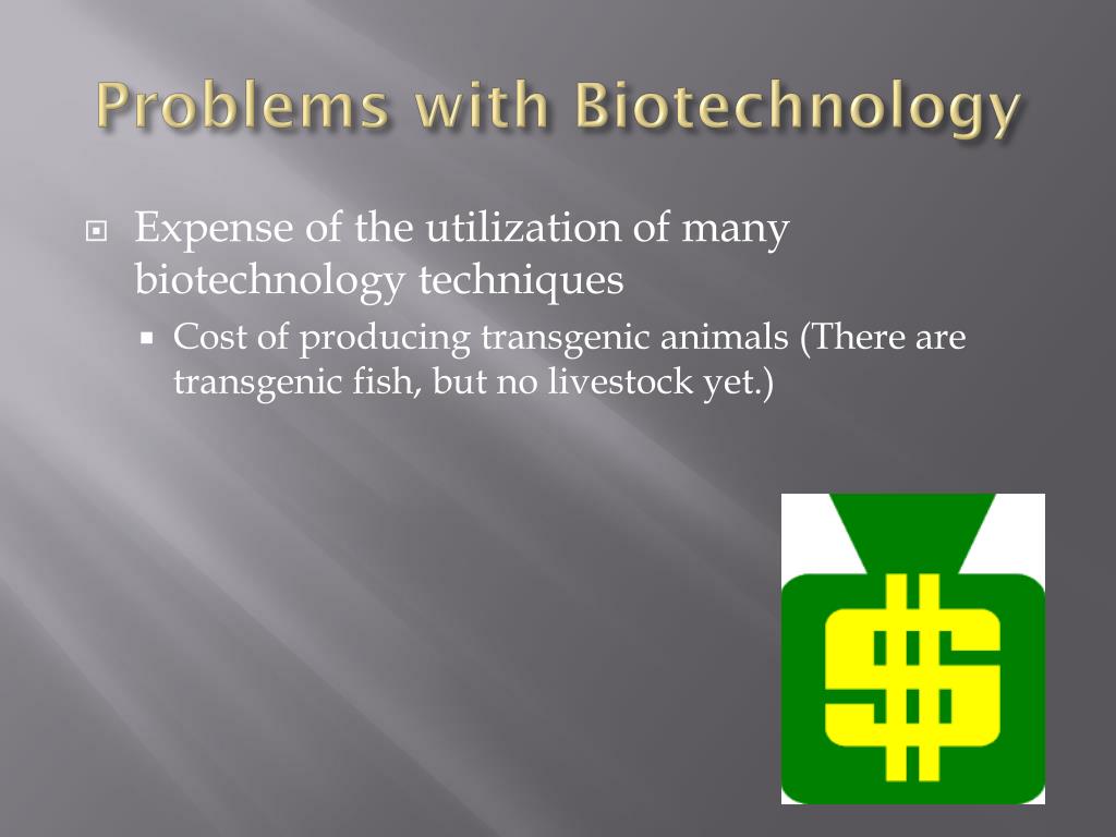 Problems with Biotechnology • Expense of the utilization of many biotechnology techniques • Cost of producing transgenic animals (There are transgenic fish, but no livestock yet.)