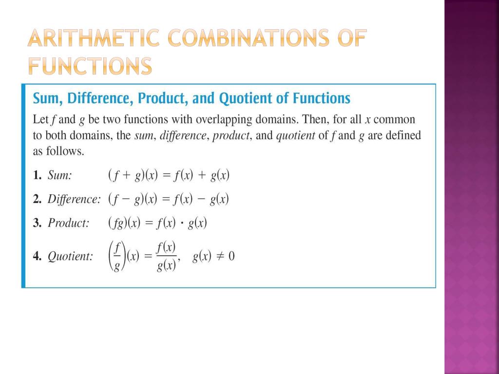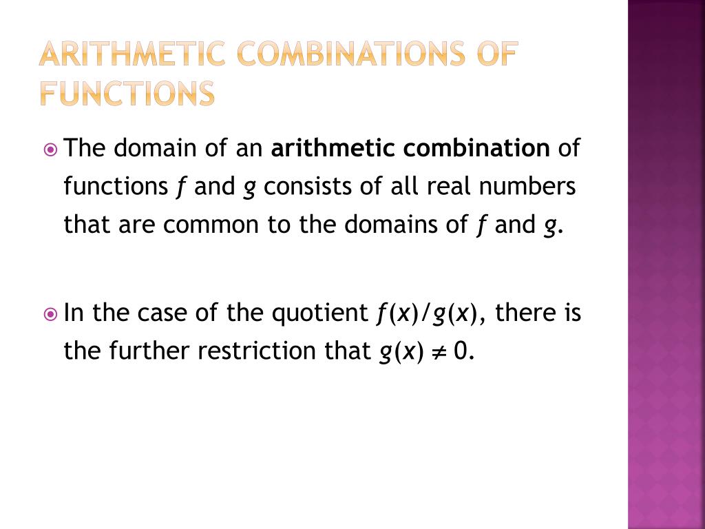 Arithmetic Combinations of Functions • The domain of an arithmetic combination of functions f and g consists of all real numbers that are common to the domains of f and g. • In the case of the quotient f(x)/g(x), there is the further restriction that g(x) 0.