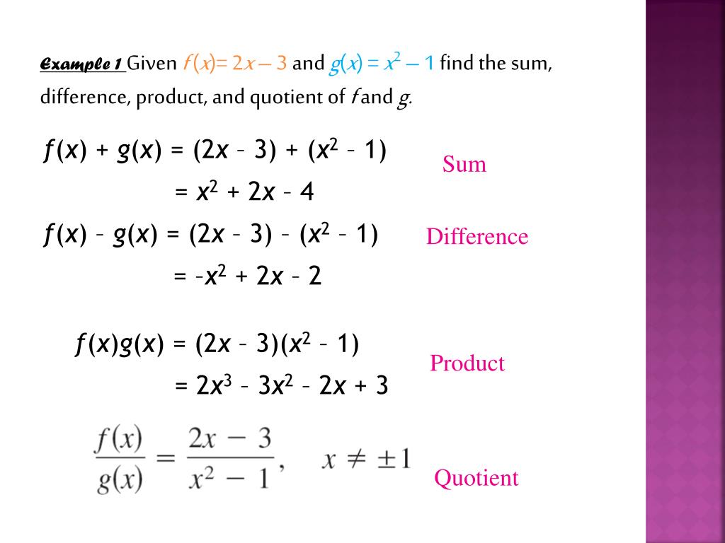 Example 1 Given f (x)= 2x – 3 and g(x) = x2 – 1 find the sum, difference, product, and quotient of f and g. f(x) + g(x) = (2x – 3) + (x2 – 1) = x2 + 2x – 4 f(x) – g(x) = (2x – 3) – (x2 – 1) = –x2 + 2x – 2 f(x)g(x) = (2x – 3)(x2 – 1) = 2x3 – 3x2– 2x + 3 Sum Difference Product Quotient